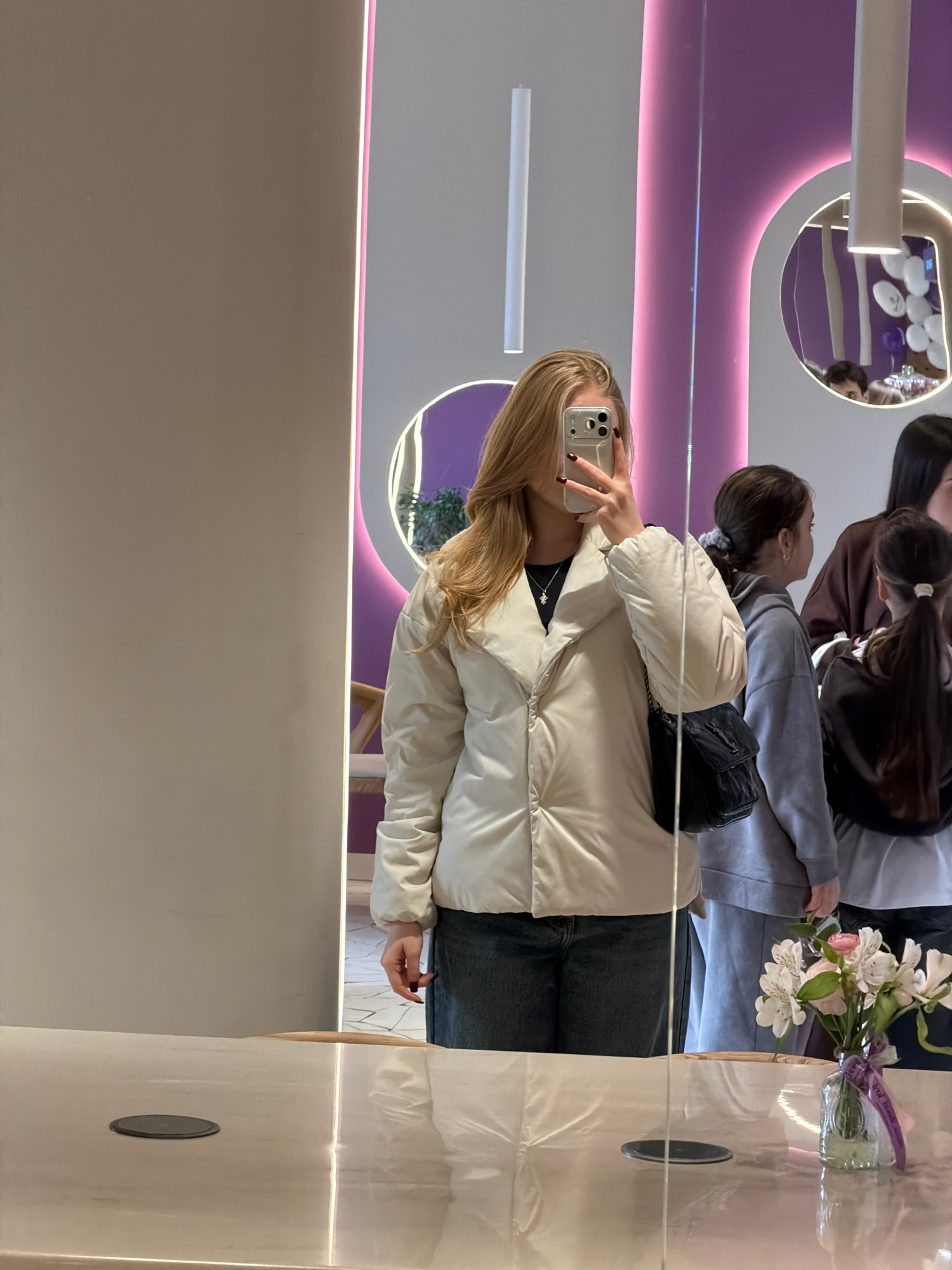 The image shows a reflection in a mirrored surface. A young woman with long blonde hair is taking a selfie with her smartphone. She wears a white puffer jacket and dark jeans. In the reflection, behin…read more