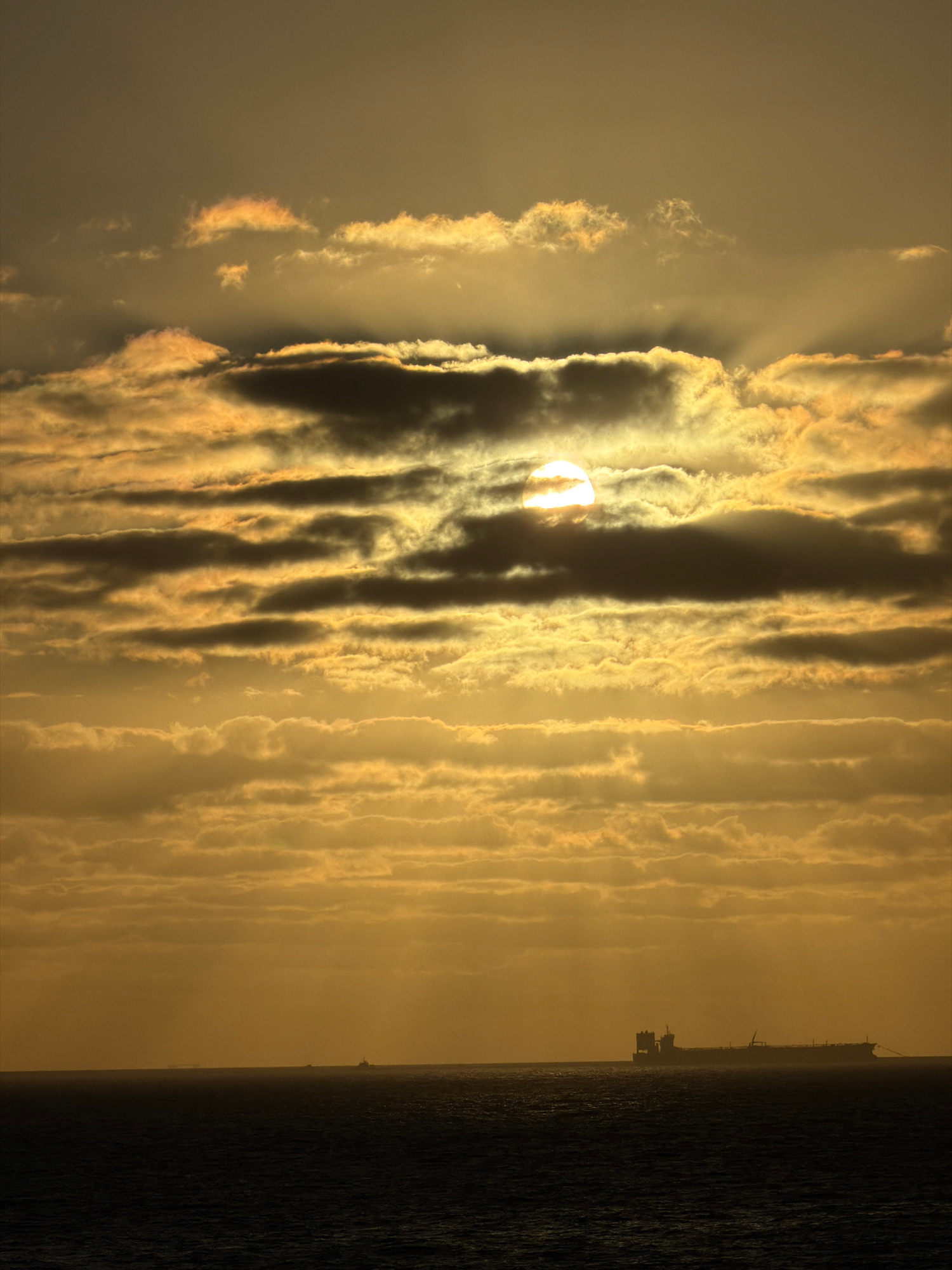 A wide-angle, medium shot depicts a dramatic sky dominated by rows of striated clouds in a muted palette of gold, brown, and grey. The sun, a bright orb, is partially obscured by the clouds, casting r…read more