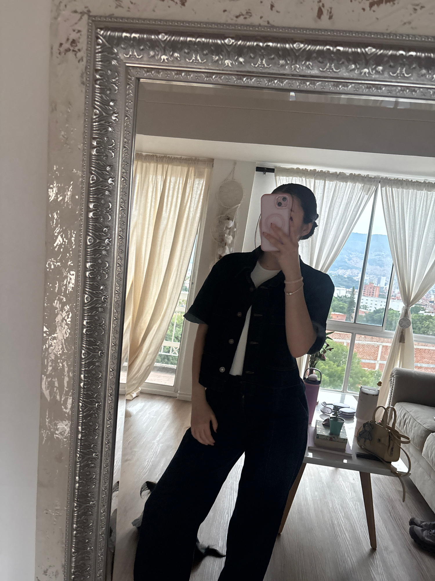 A person stands in front of a large, ornate silver-framed mirror, holding a pink phone to take a selfie. They are wearing a black denim jacket and dark pants. Through the window behind them, a citysca…read more