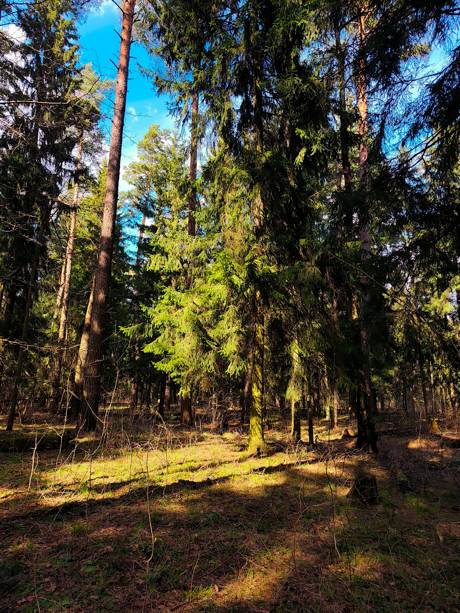This media file captures a sunlit forest scene in Kratovo, Russia. The primary subjects are numerous tall coniferous trees, likely a mix of pines and spruces, with dense green foliage. Their trunks as…read more
