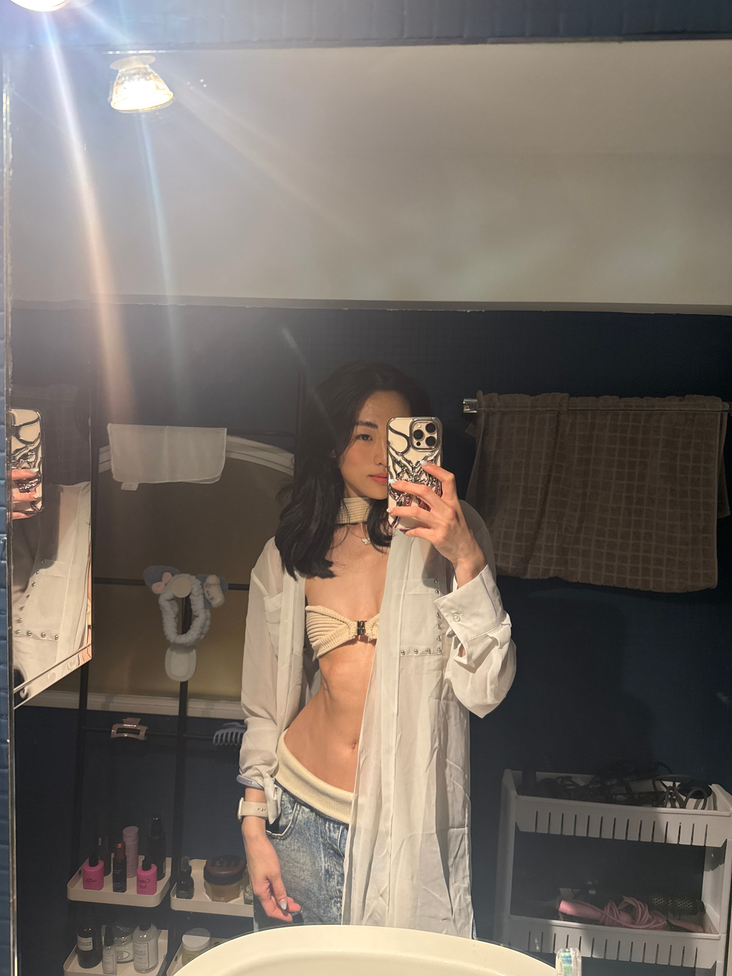 A woman is taking a selfie in a bathroom mirror. She is wearing a white shirt over a beige knit top and denim shorts. The bathroom has blue walls and a variety of items, including towels, storage shel…read more