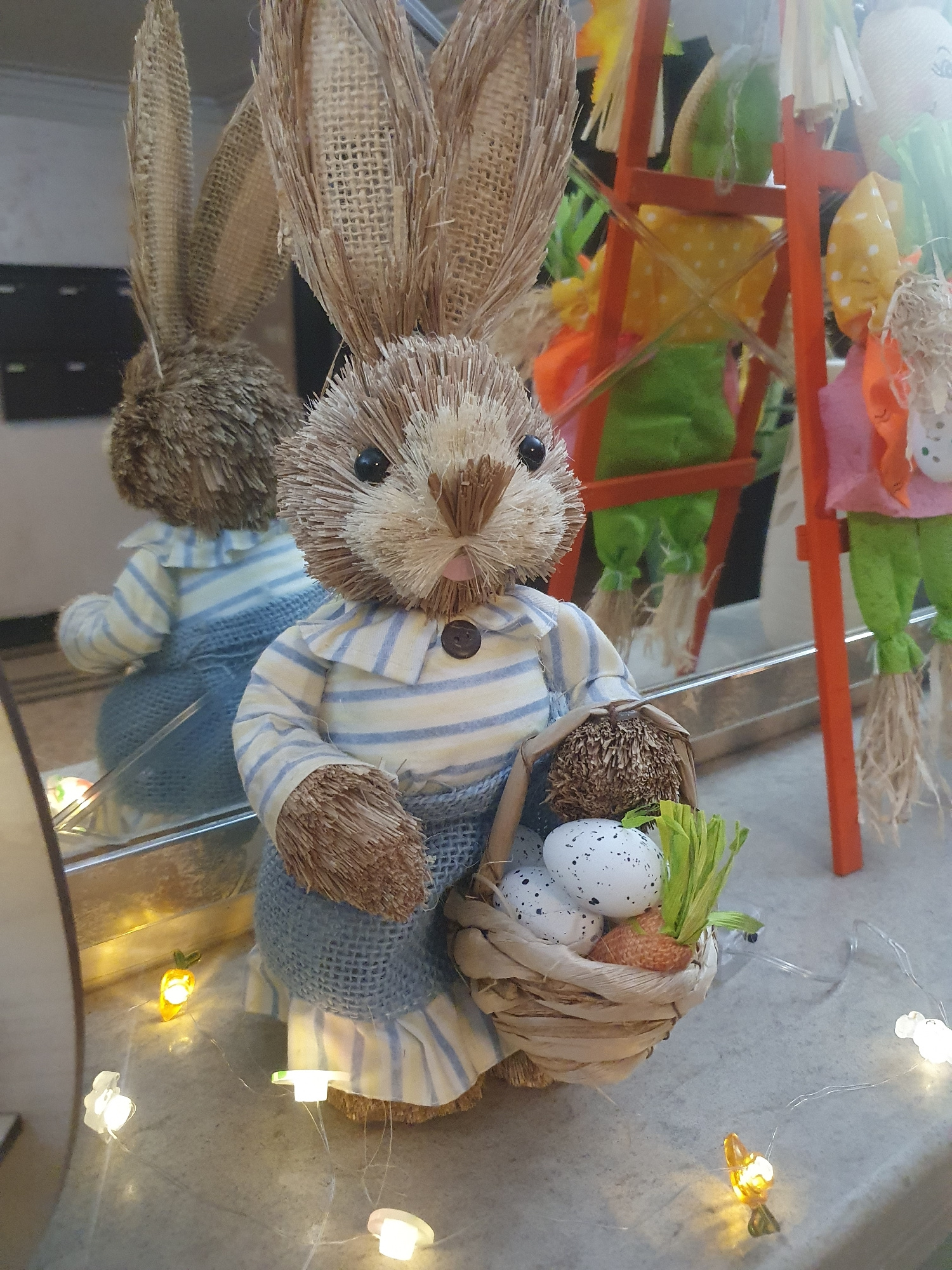 The image shows a straw-like rabbit figurine wearing a blue-striped shirt and overalls. It is sitting next to a woven basket containing straw, speckled eggs, and a toy carrot with green leaves. A miniβ¦read more