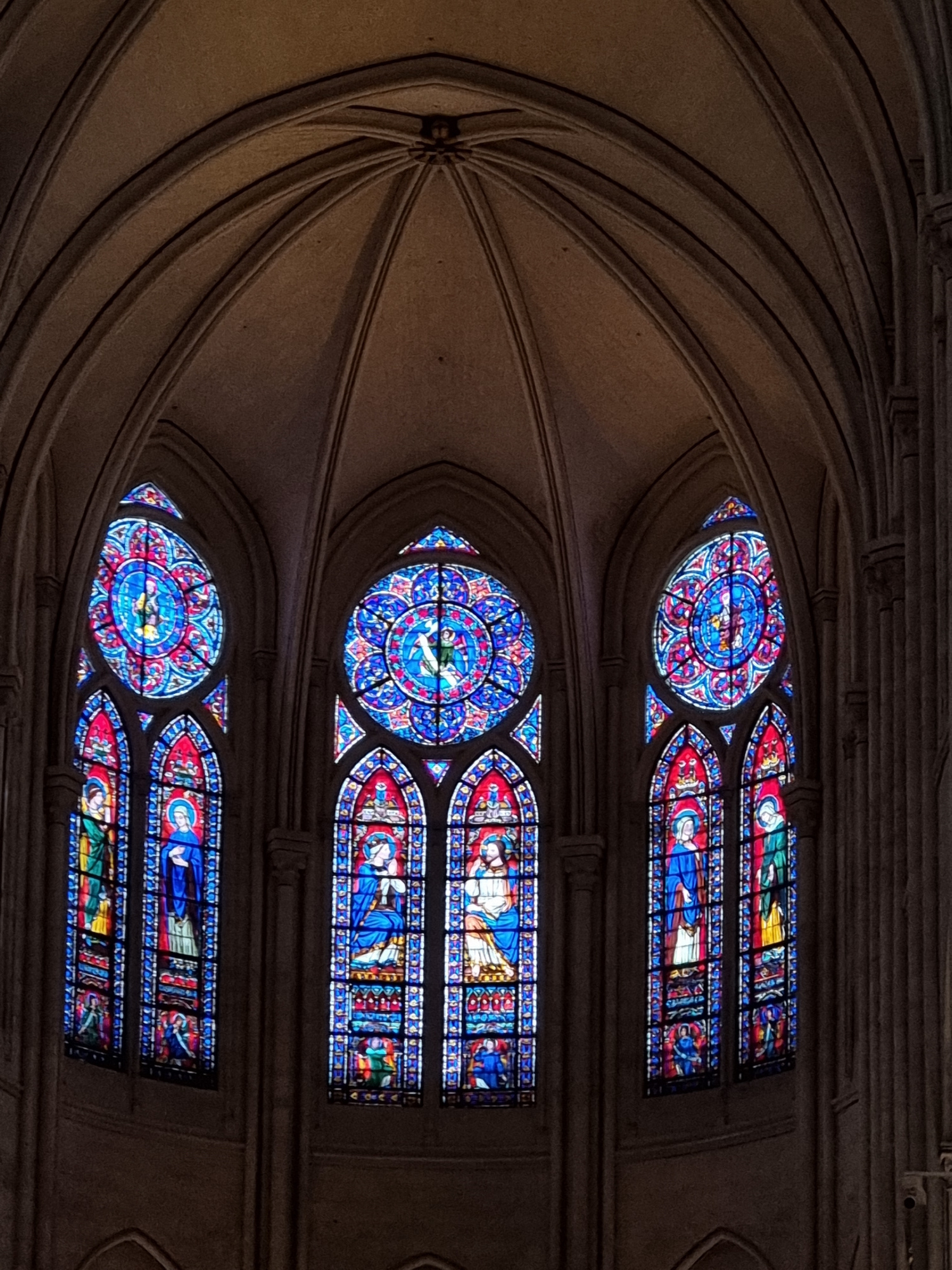 The image shows the ceiling and stained glass windows of Notre Dame Cathedral in Paris, France. The ceiling features ribbed vaulting in a Gothic style, composed of arched beams that converge at a cent…read more