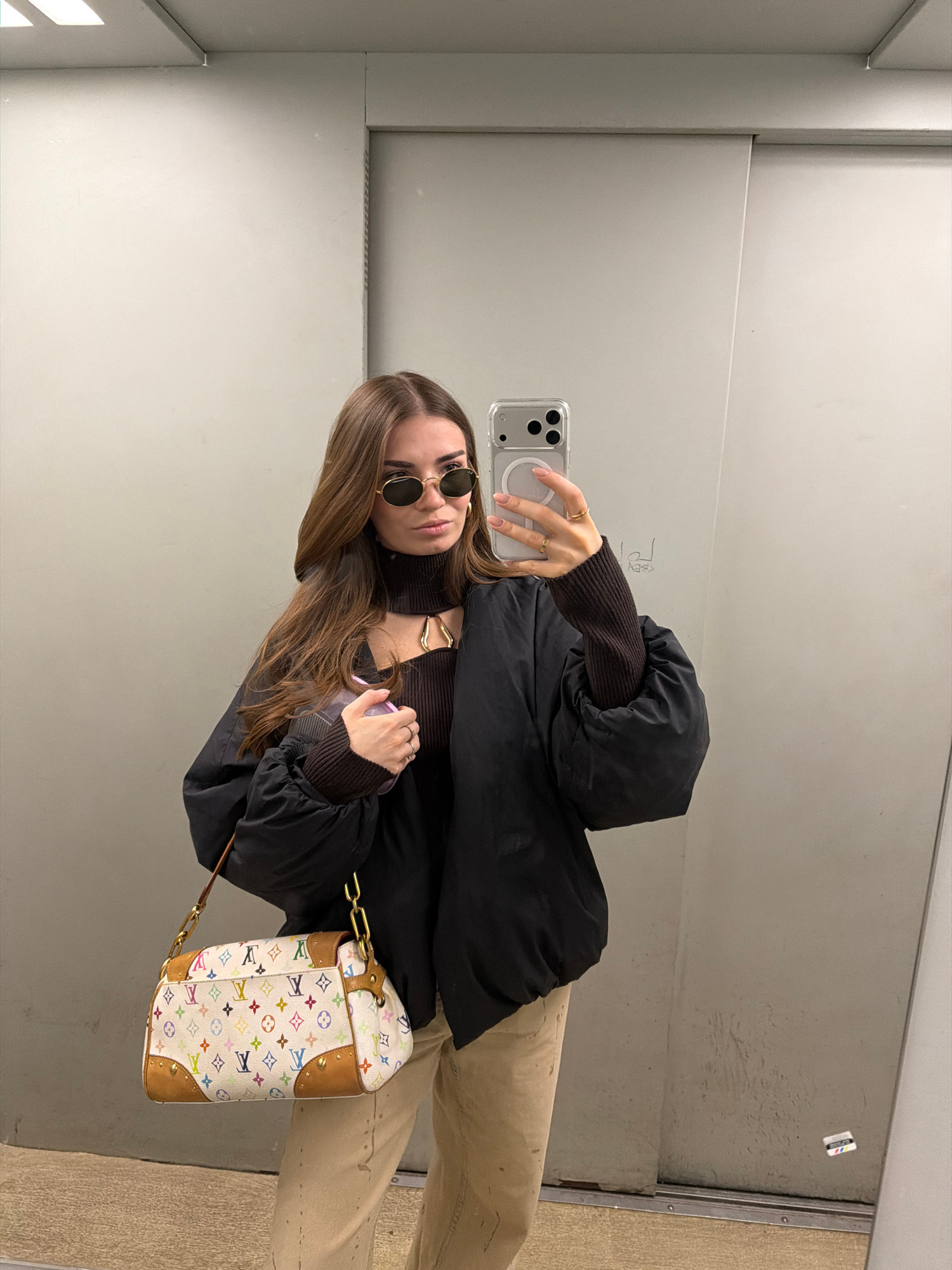 A woman is taking a selfie in what appears to be an enclosed space, possibly an elevator or a fitting room. She is holding her phone in her left hand, and it is in a clear case. The woman is wearing a…read more