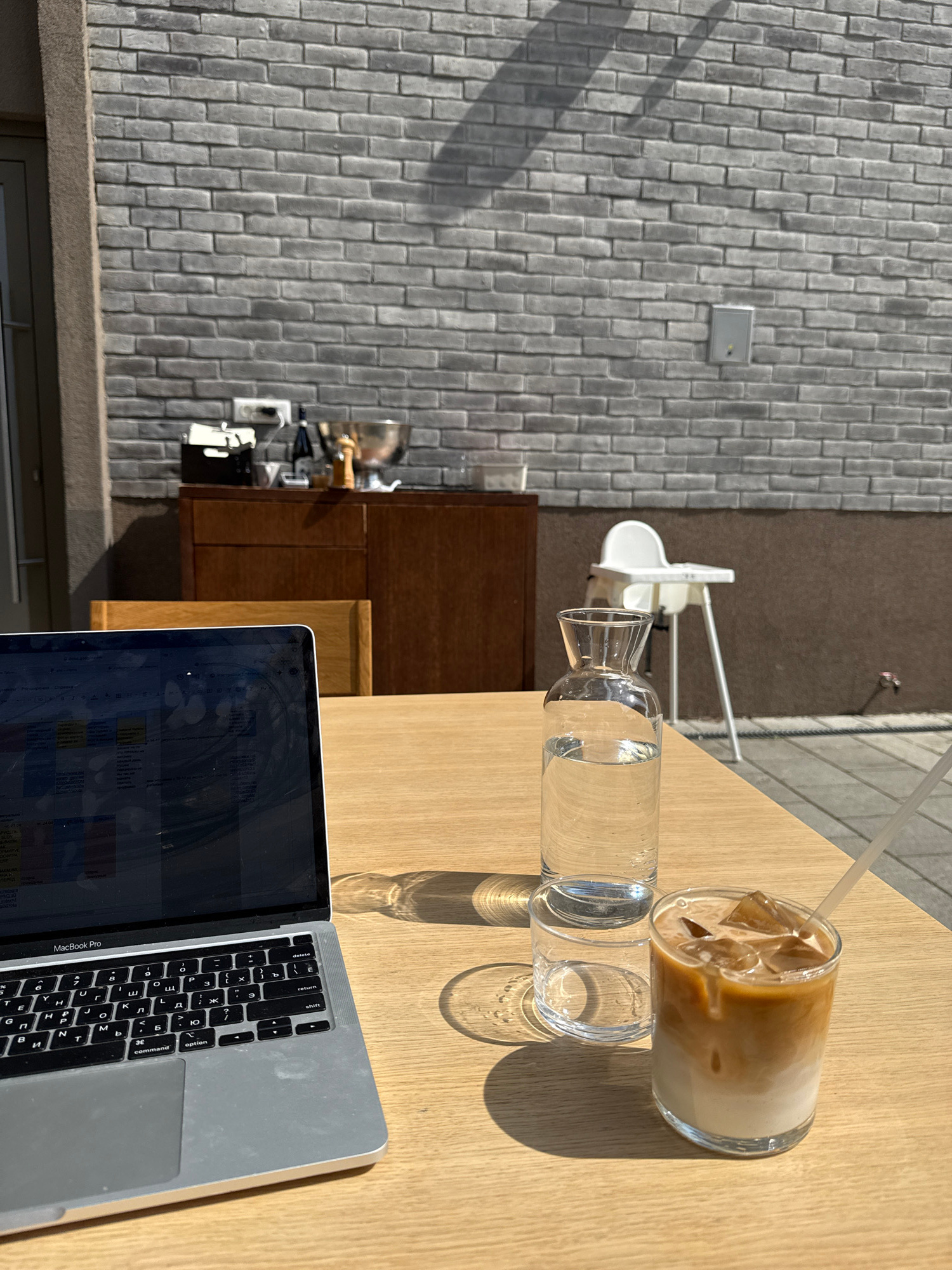 This is an overhead shot of an outdoor cafe table, likely in Belgrade, Serbia, given the provided context and the Cyrillic keyboard layout. The image is bathed in bright sunlight, casting sharp shadow…read more