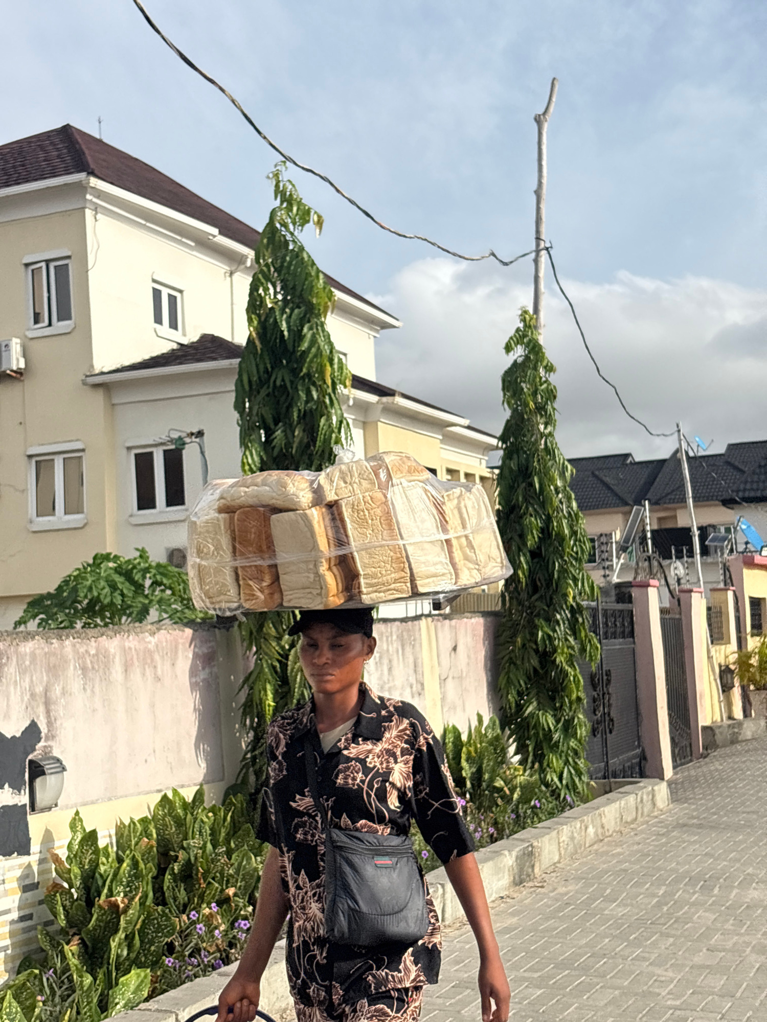 The image shows a man walking in Igboefon, Nigeria with several loaves of bread stacked on his head. He is wearing a black floral shirt and carrying a black bag on his shoulder. The loaves of bread arβ¦read more