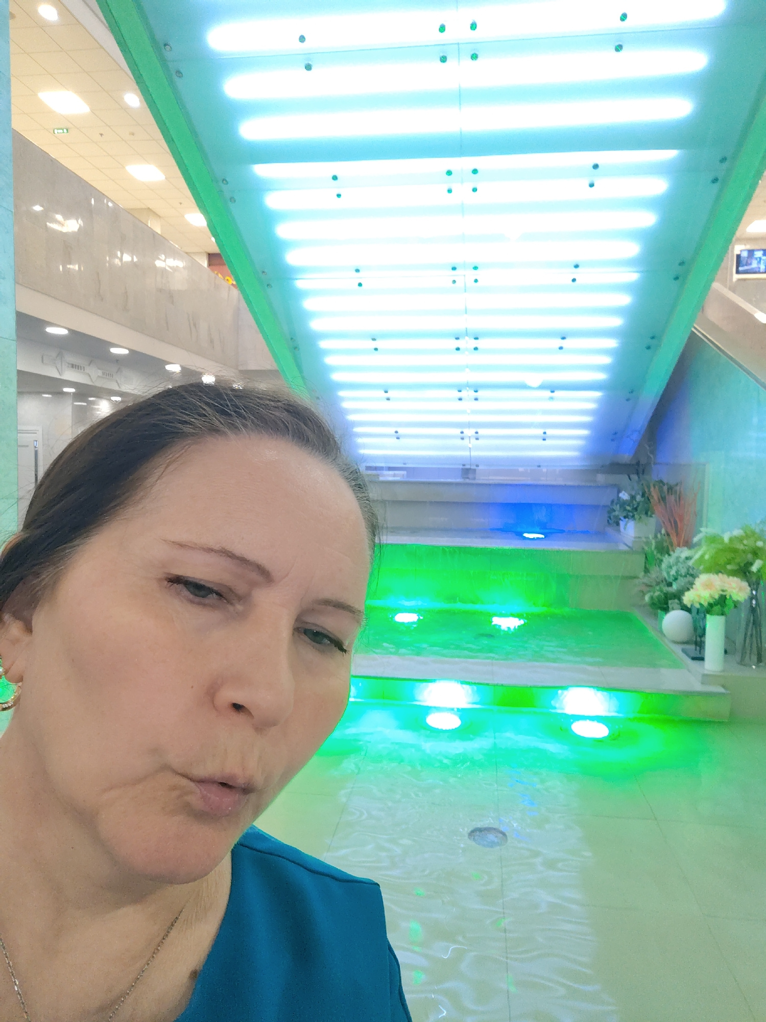 A woman is captured in a selfie-style shot, her face filling the left side of the frame, with an indoor public space in the background. She appears to be middle-aged, with her dark hair pulled back. H…read more