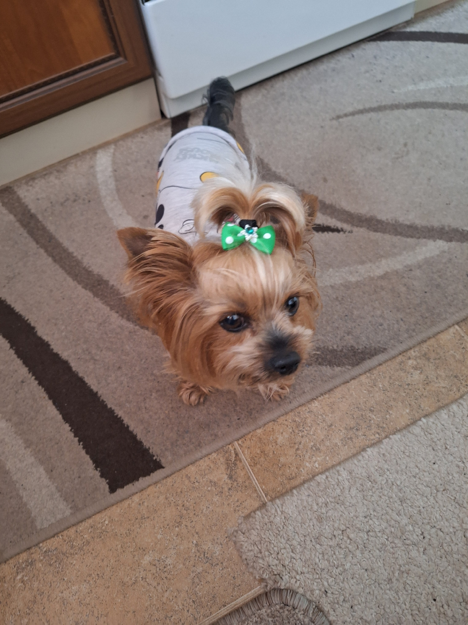 A small, tan Yorkshire Terrier dog wearing a grey and white patterned shirt and a green bow in its hair is positioned on a tan and brown striped rug. The dog is looking up at the camera. To the left o…read more
