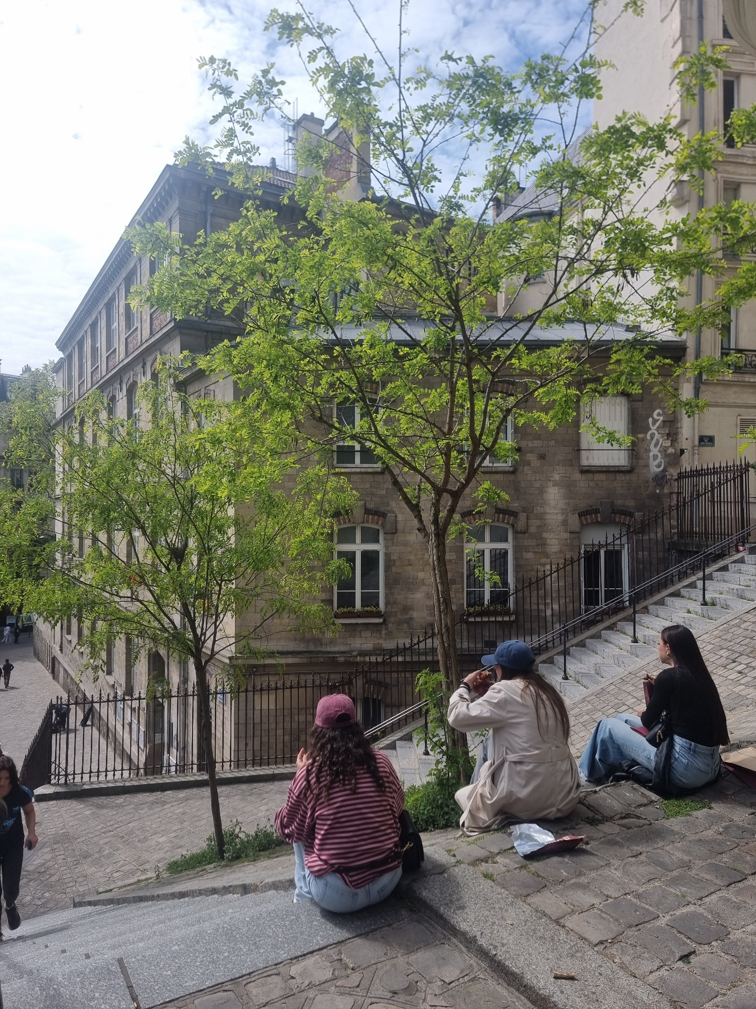 The image, taken in what appears to be Paris, France, shows a vibrant street scene on a bright day. Three individuals are prominently featured in the foreground, seated or crouched on a cobblestone-pa…read more