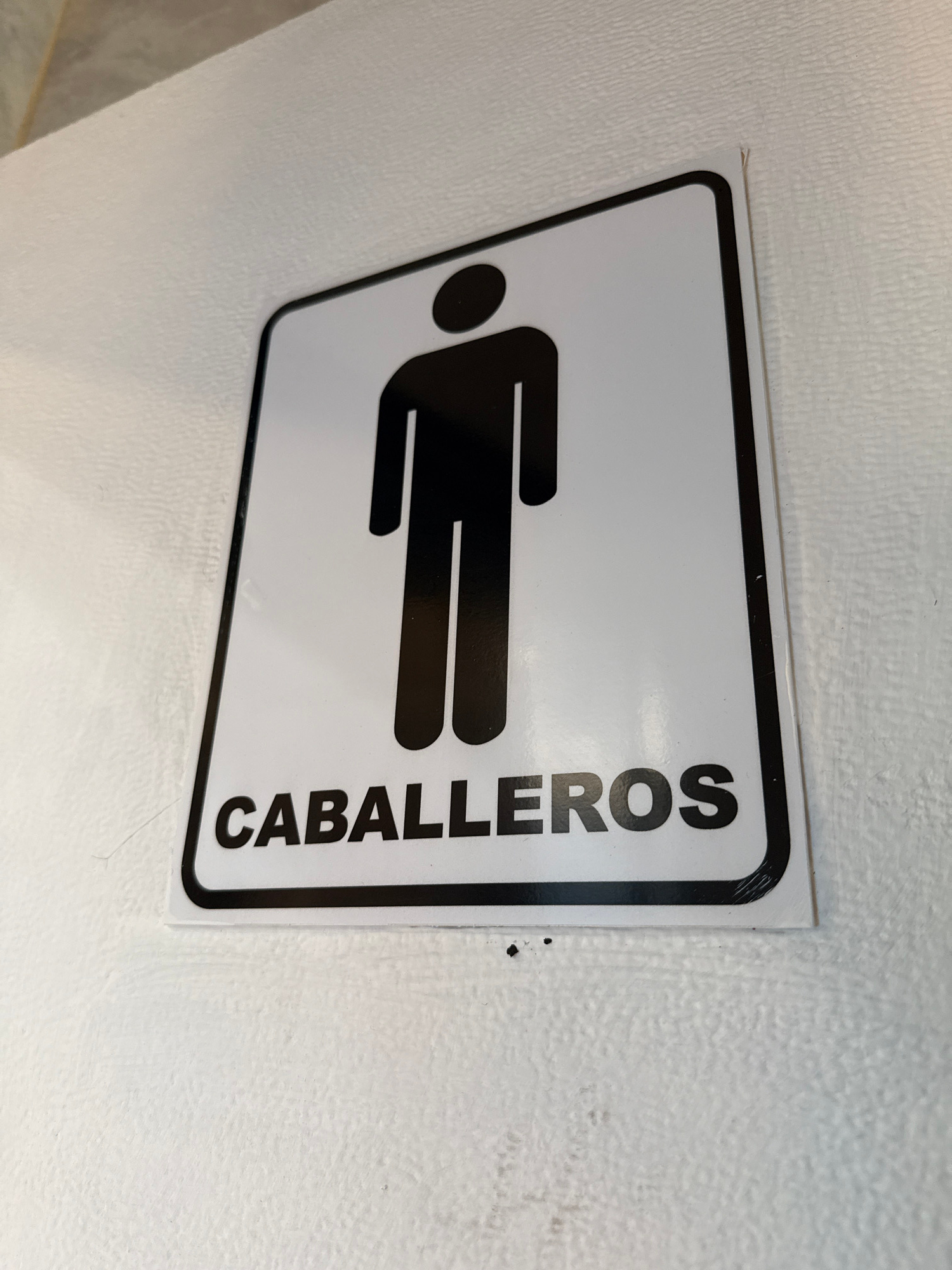 A sign for the men's restroom (Caballeros in Spanish) is affixed to a white wall. The sign is white with a black border and black text. A stylized figure of a man is displayed on the left. The locatio…read more