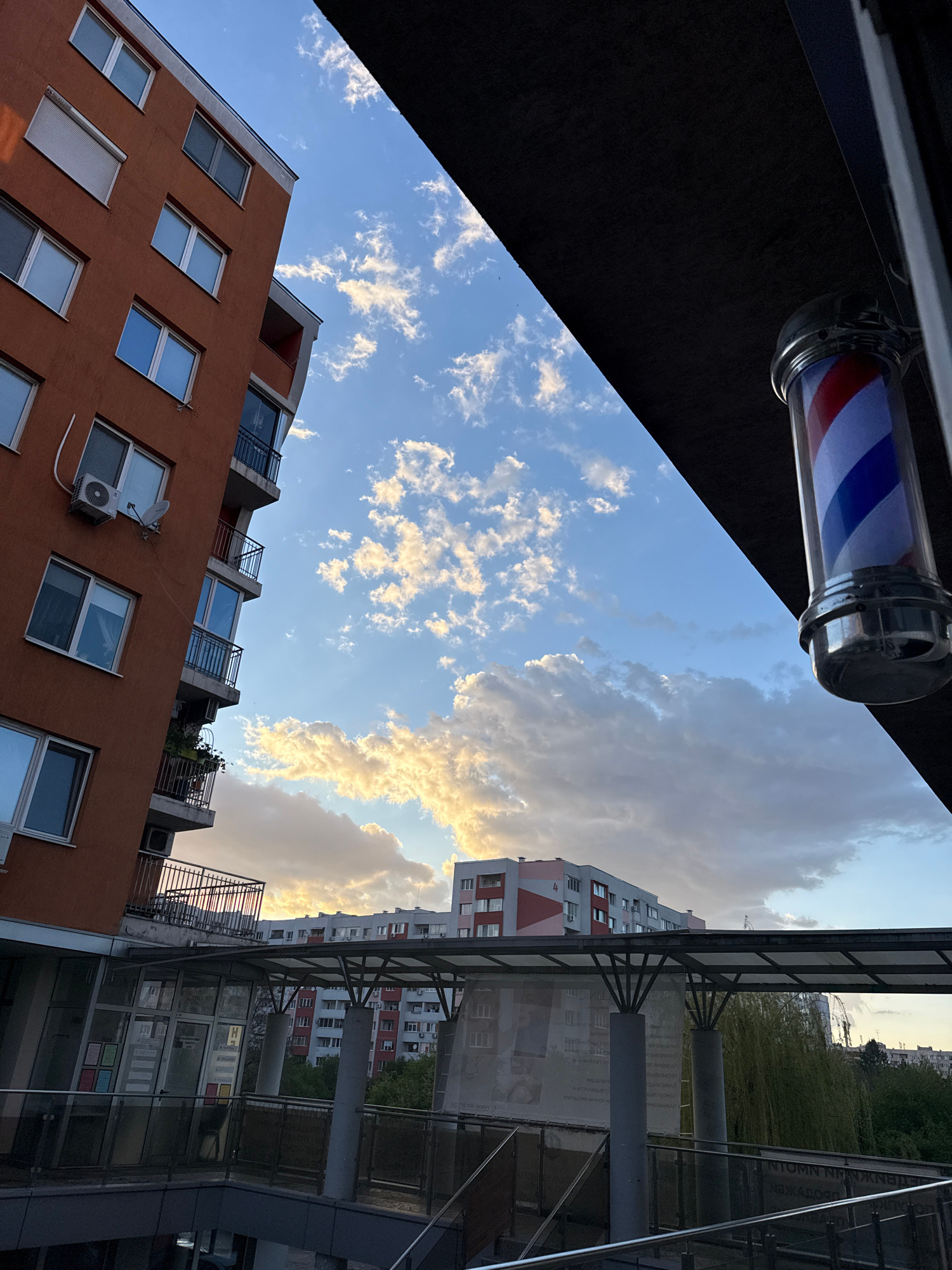 The image, taken from a low angle, features a barbershop pole in the upper left corner, characterized by red, white, and blue stripes. The view extends upward to reveal a sky with scattered clouds, ex…read more