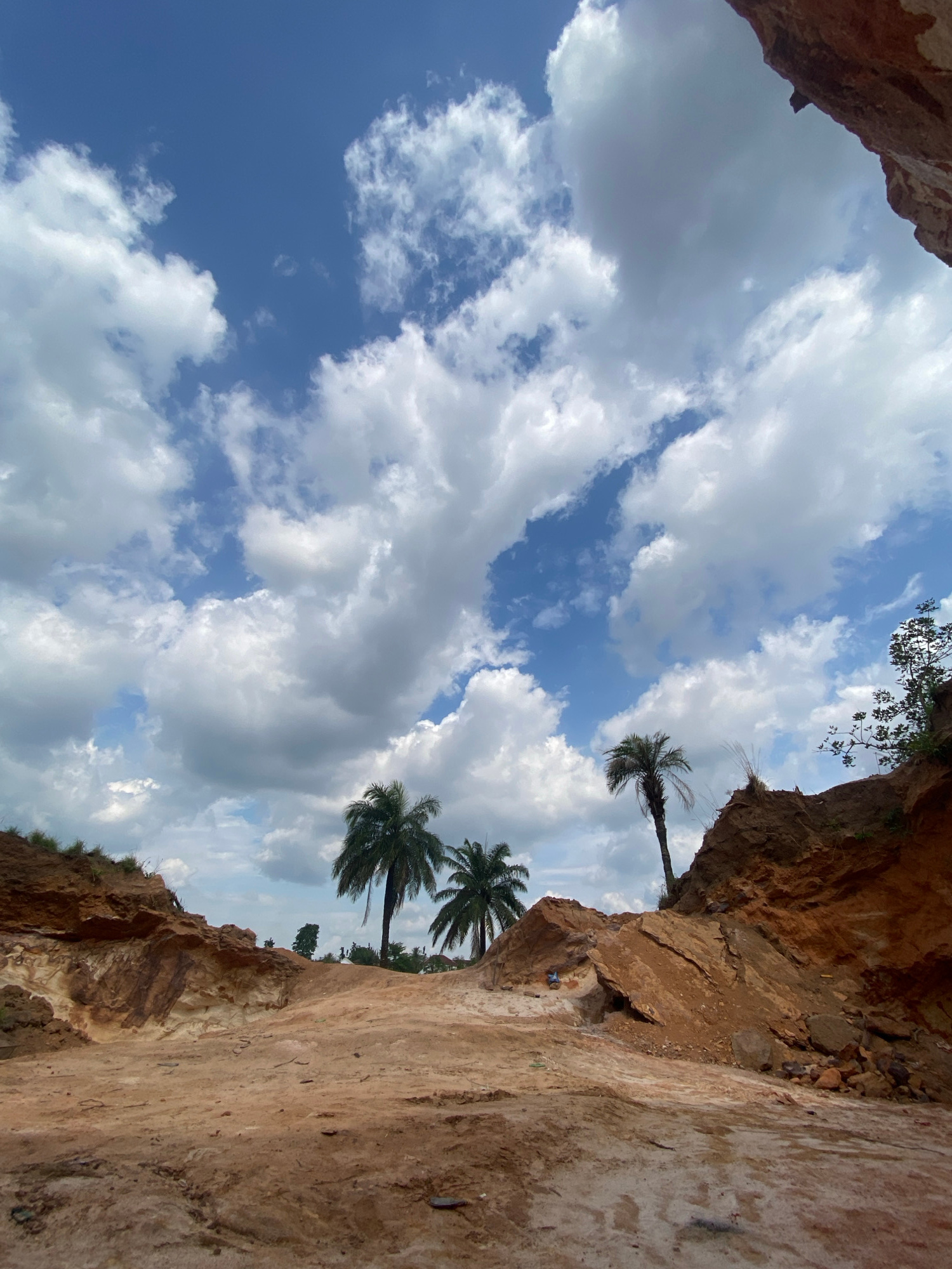 The image shows a low-angle view looking up at the sky through a canyon or quarry. The sky is blue with numerous white clouds. The canyon walls are reddish-brown and appear to be composed of sandstone…read more