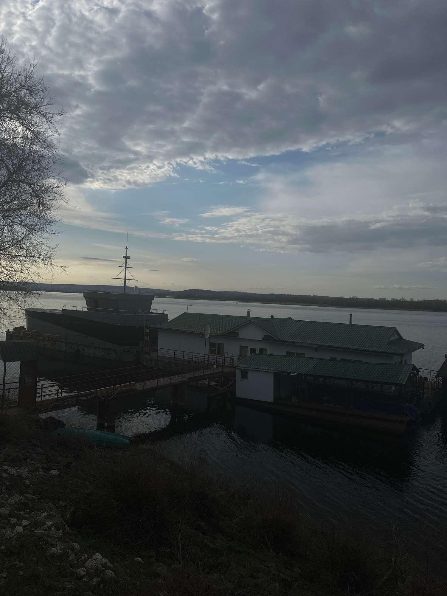 The image depicts a river scene in Engels, Russia. The sky is overcast with dramatic clouds. In the foreground, bare tree branches are visible, and along the shoreline, there is vegetation and rocky t…read more