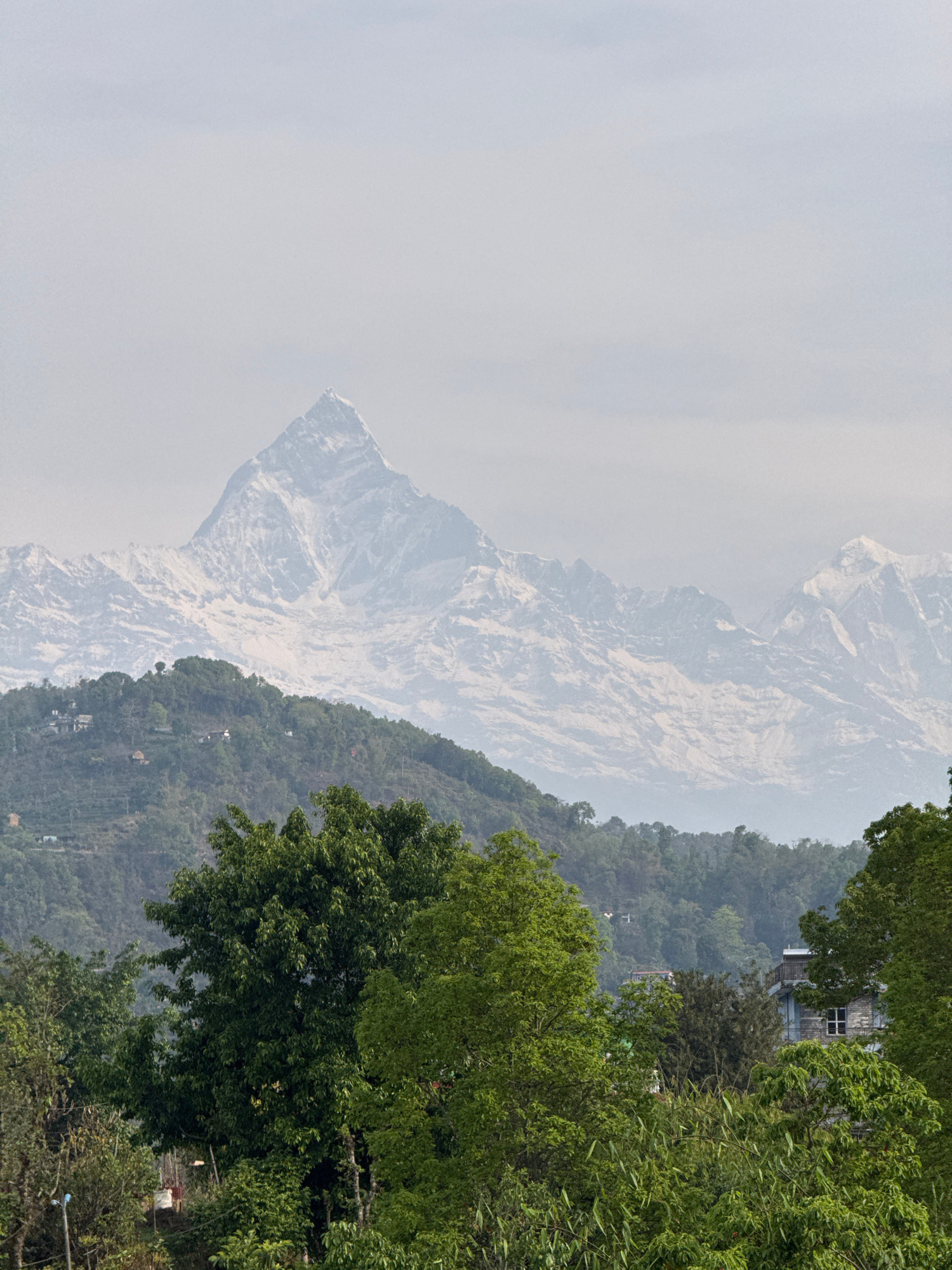 The image presents a scenic view from Pokhara, Nepal, showcasing a towering, snow-capped mountain in the background, partially obscured by haze. The foreground features lush green trees and vegetation…read more