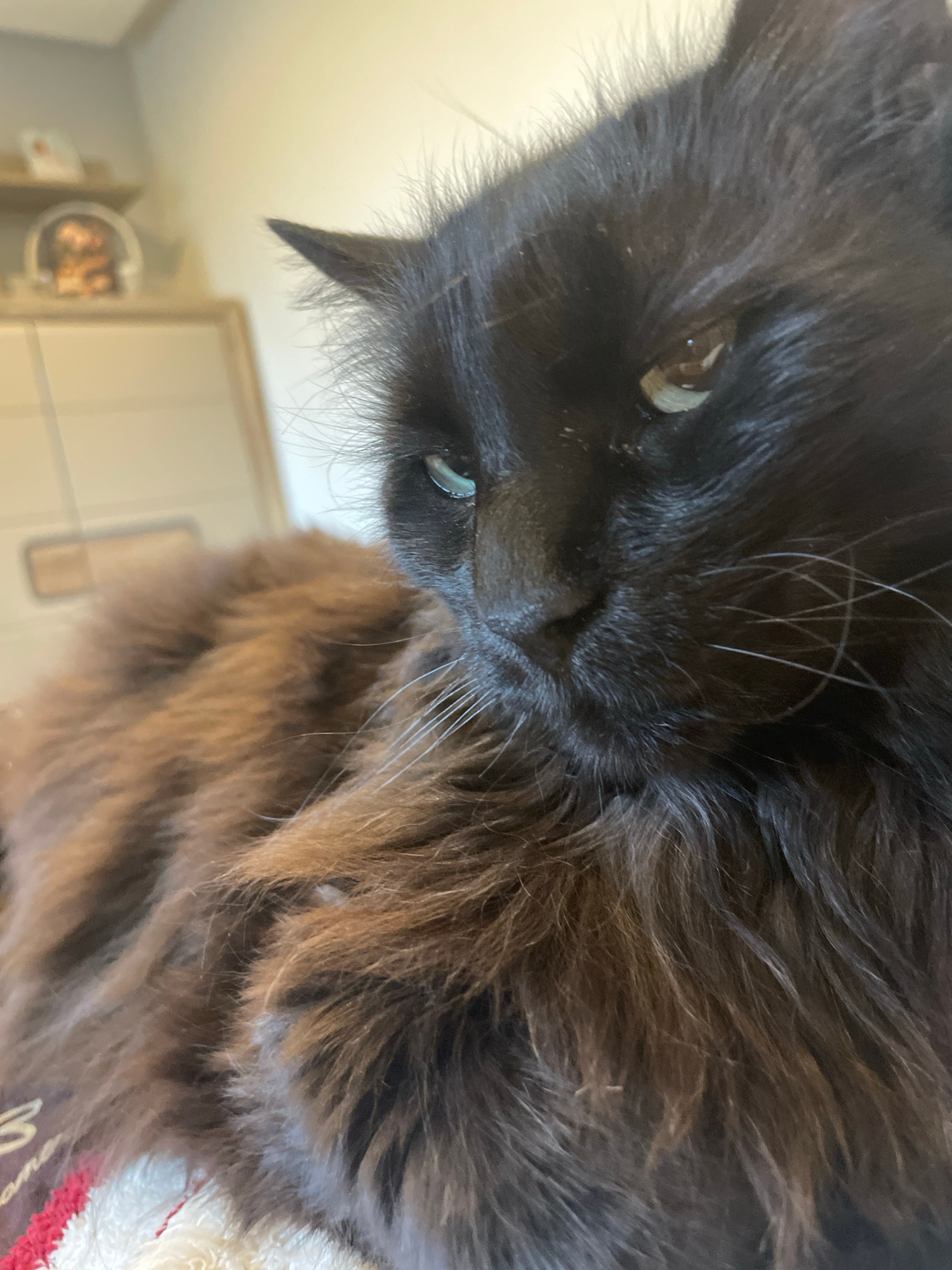A close-up, slightly angled view of a black cat with long fur. The cat's head dominates the frame, with its face tilted downwards. One eye is visible with a green-yellow iris. Long white whiskers protβ¦read more