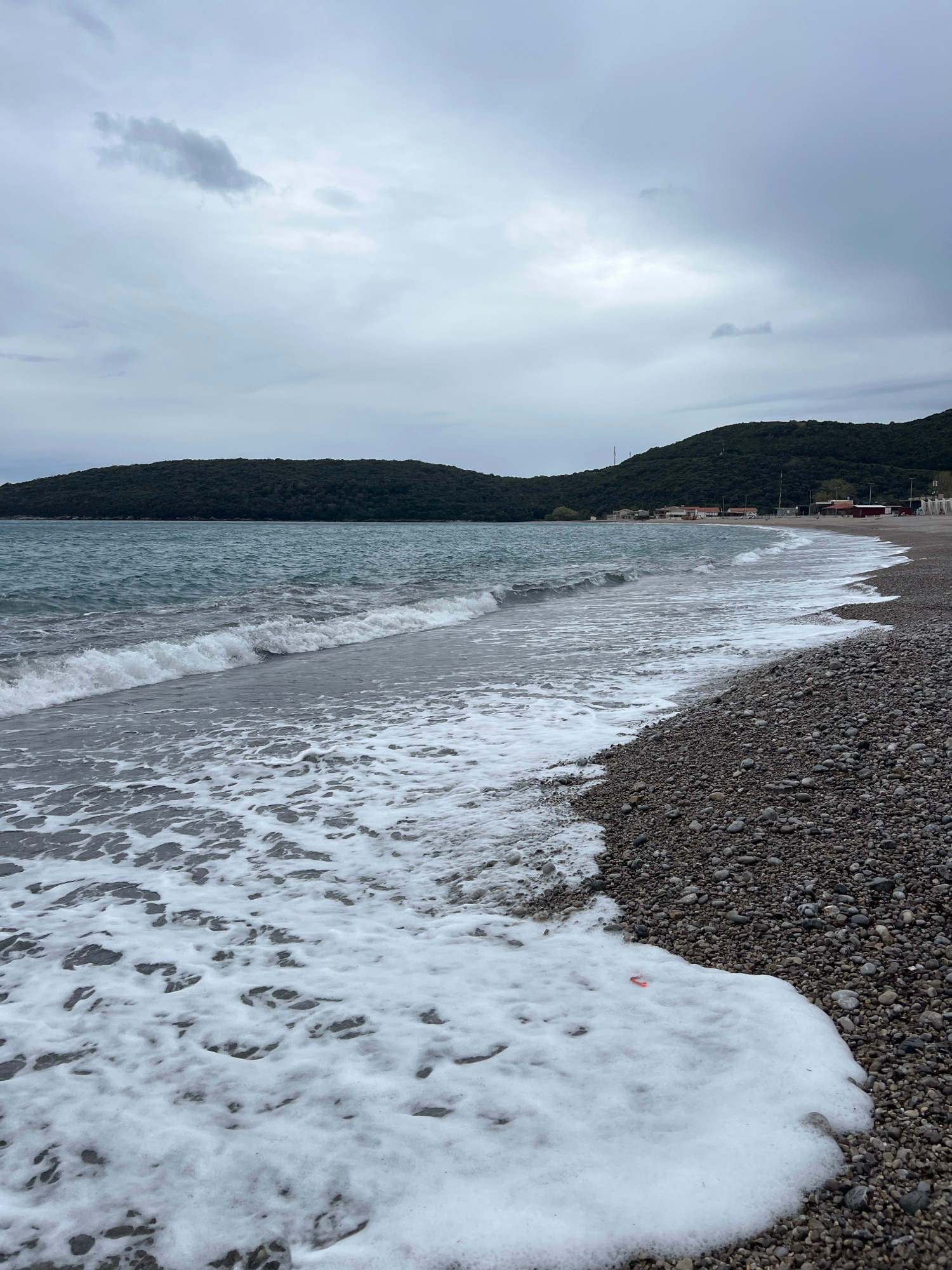 The image depicts a rocky beach in Prijevor, Montenegro, on an overcast day. White foamy waves are crashing onto the beach, which consists of small, dark-colored pebbles. A forested mountain rises alo…read more
