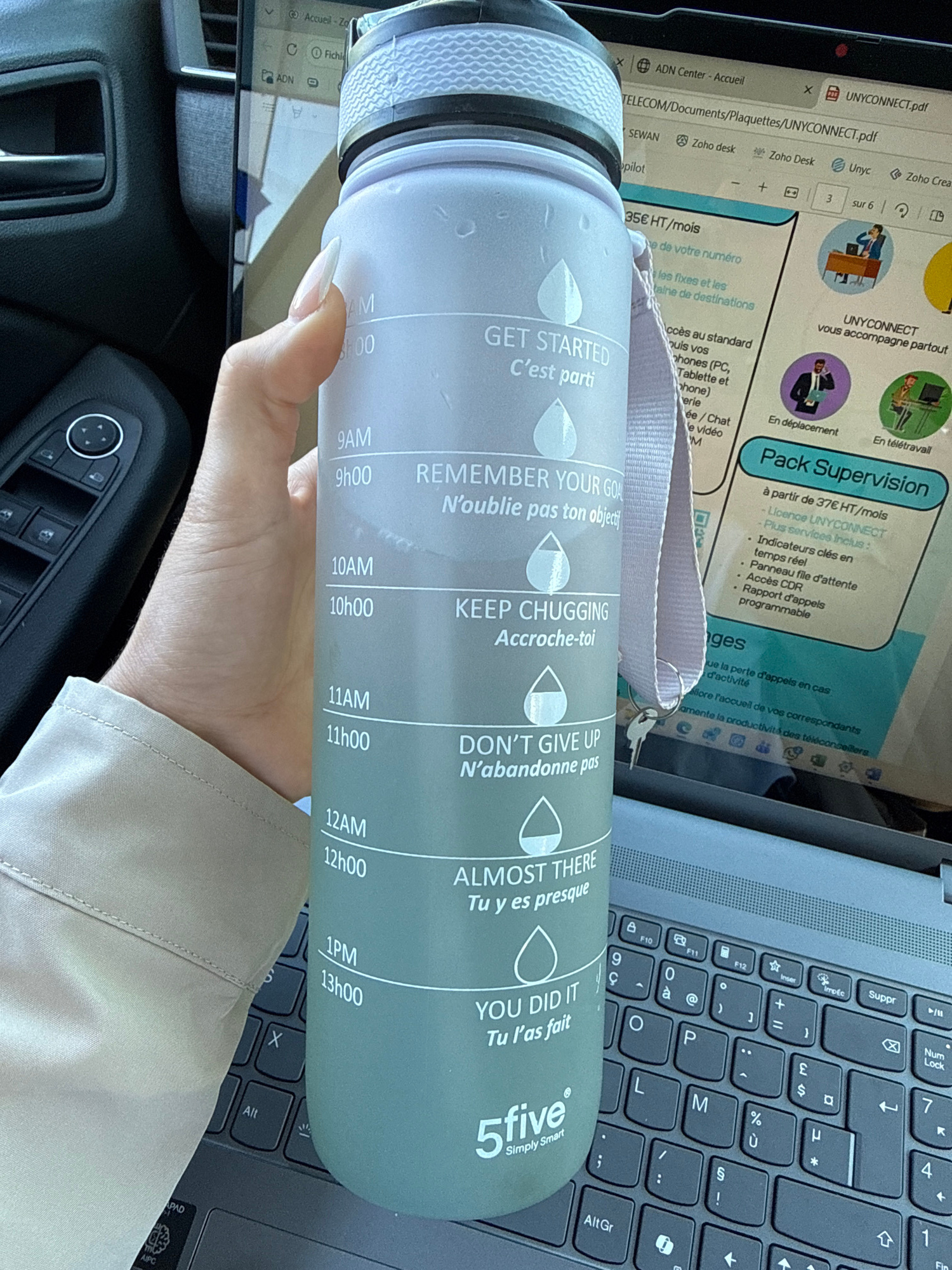 The scene shows a person sitting in a car with a laptop and a water bottle with time markers. The laptop screen displays a document related to telecommunications company UNYCONNECT, with a French inte…read more