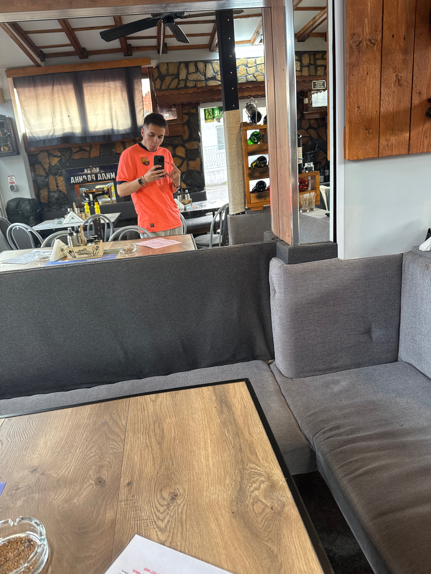 A man in an orange Barcelona shirt is taking a selfie in a mirror. The mirror reflects the interior of a building with a stone wall and ceiling beams. The building appears to be a bar or restaurant wi…read more