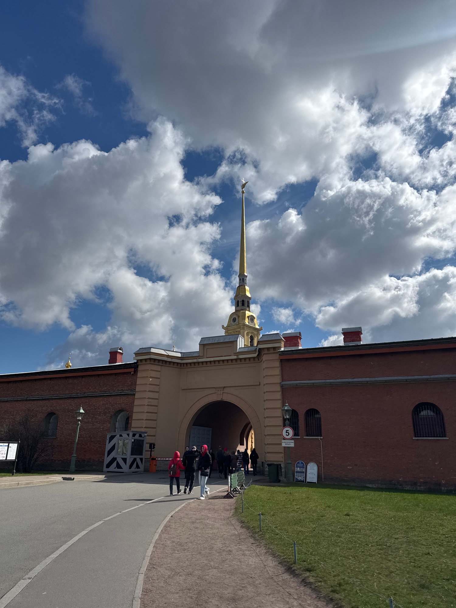 The image depicts the Peter and Paul Fortress in Saint Petersburg, Russia. A golden spire rises against a backdrop of blue sky and white clouds. People are entering the fortress through an archway in…read more