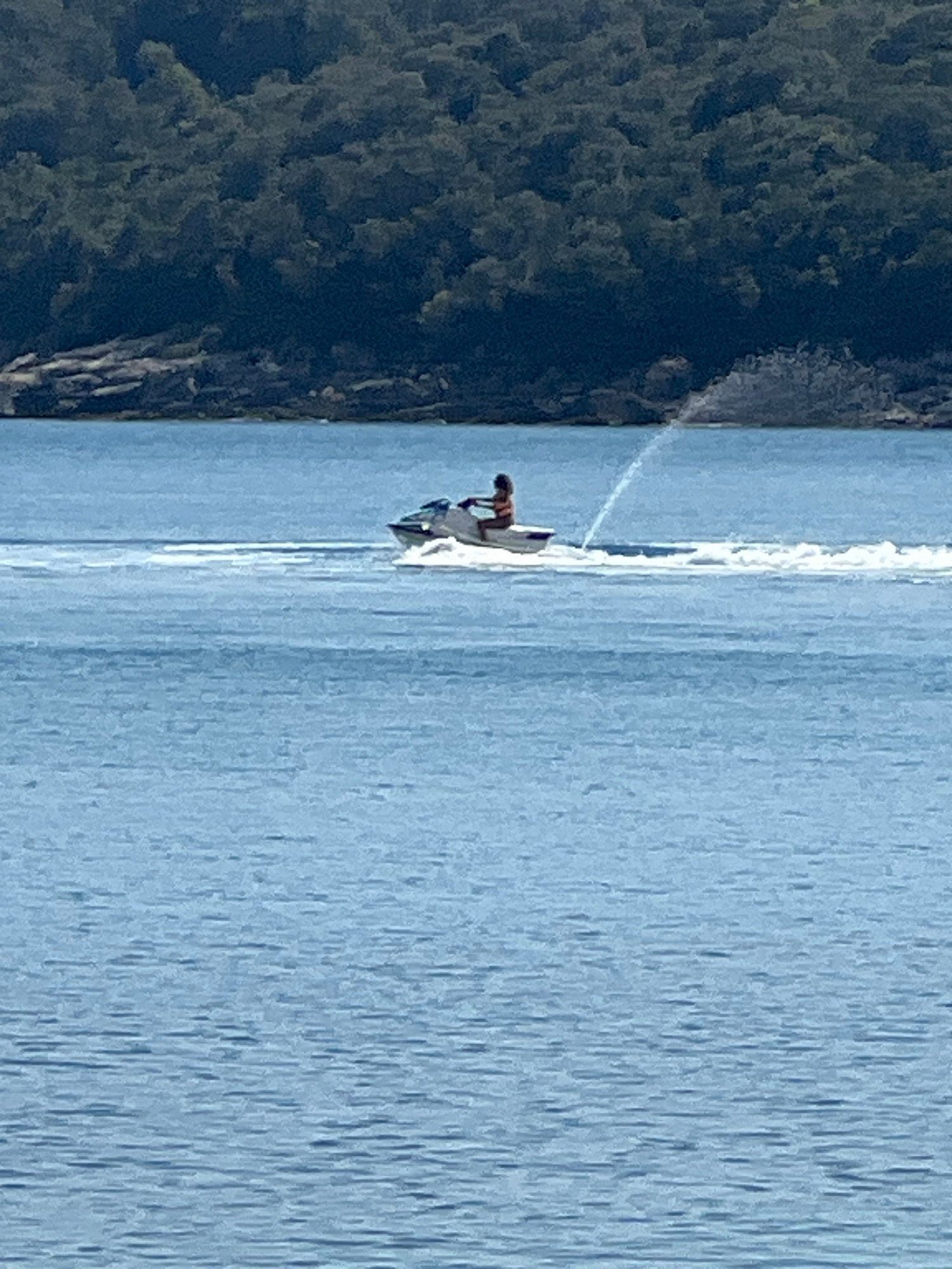The image captures a recreational scene on a vast body of water, likely a lake or fjord, against a backdrop of dense, dark green, tree-covered mountains or hills. A single individual is visible operat…read more