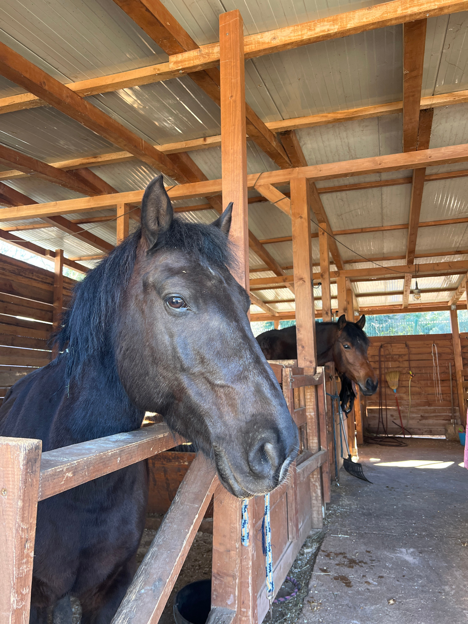 Two horses are in a stable with a wood frame. The heads and necks of the horses are visible. The stable is constructed of wood. The image has been rotated 90 degrees. The location is not specified as…read more