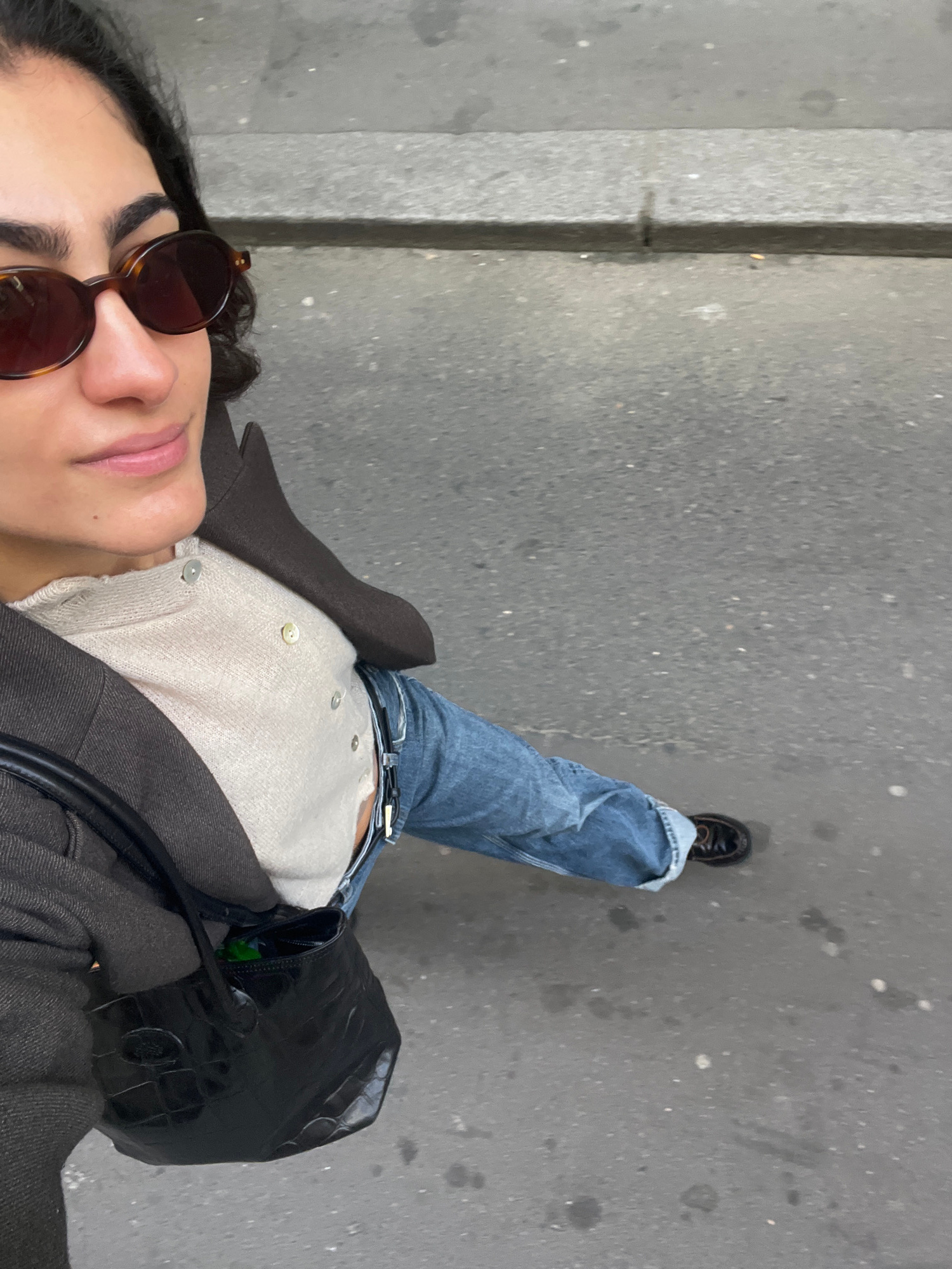 A high-angle selfie captures a person from an overhead perspective, looking upwards towards the camera, suggesting they are holding the camera themselves. The individual has dark, wavy hair and wears…read more