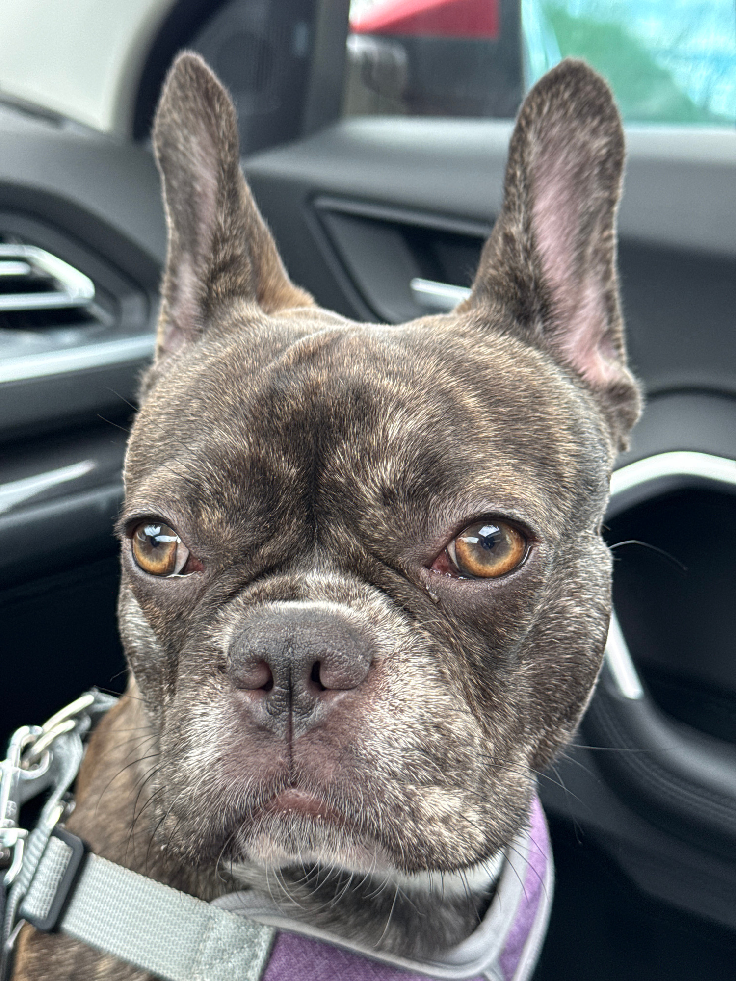 A brindle-colored French Bulldog is visible in the image. The dog is wearing a gray and purple harness, with its head tilted slightly. It appears to be indoors, possibly in a car. The background shows…read more