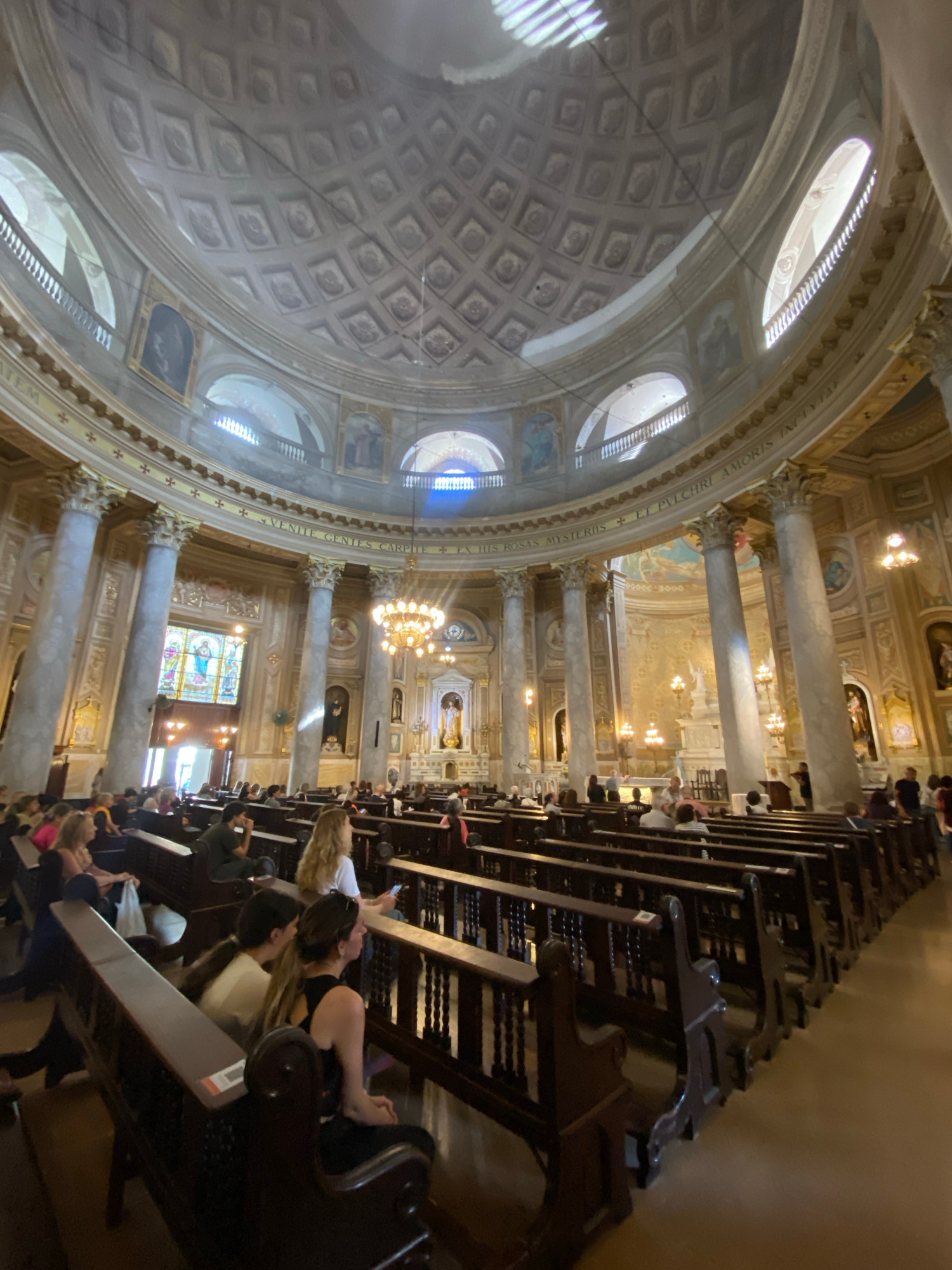 The image captures the interior of a church, possibly a basilica or cathedral, featuring a high, intricately patterned dome with windows. The space is adorned with columns and architectural detailing.…read more