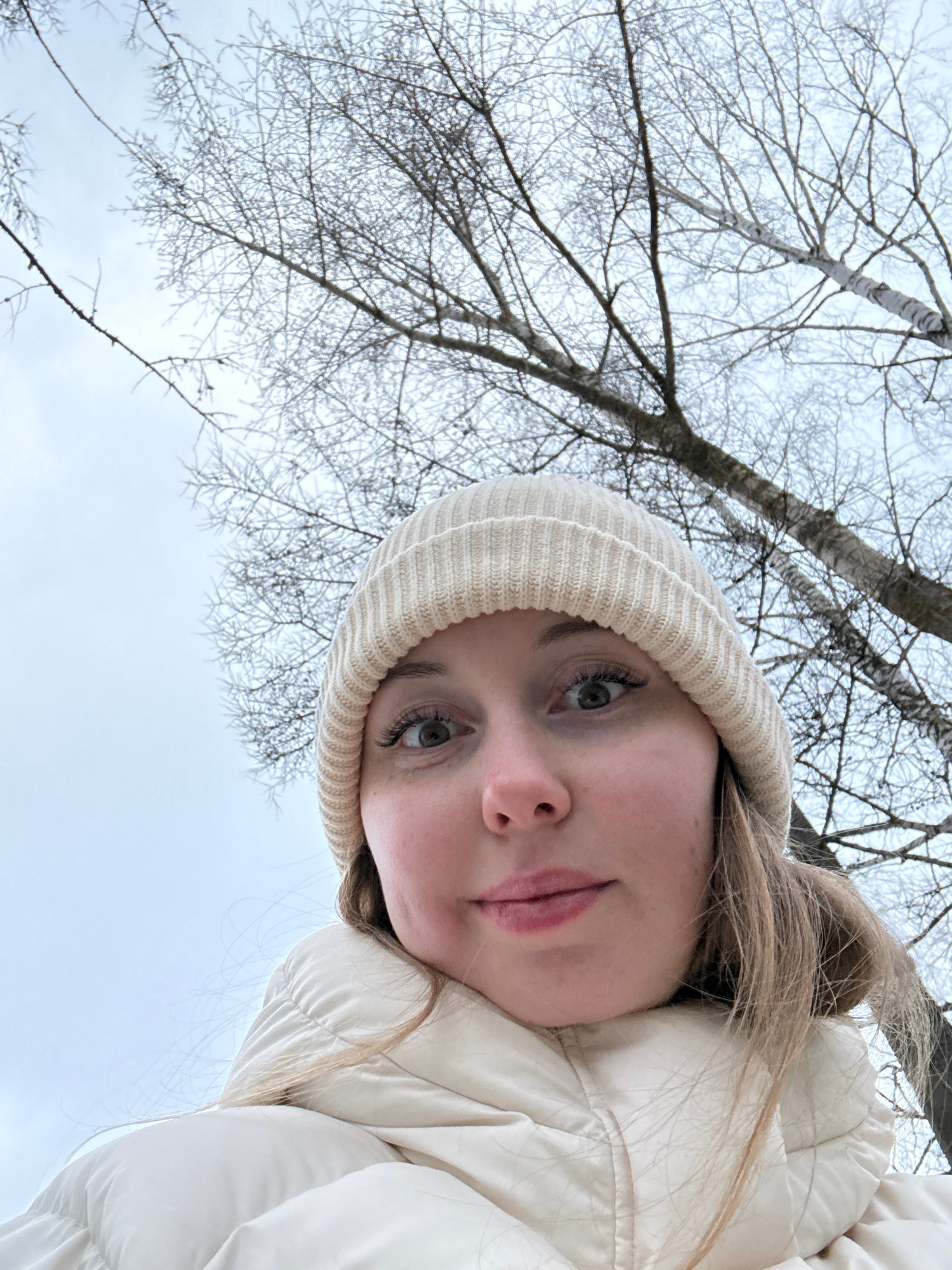 A low-angle selfie of a woman wearing a light-colored beanie and puffer jacket. The background features bare tree branches against a pale sky, possibly indicating winter or early spring. The location…read more