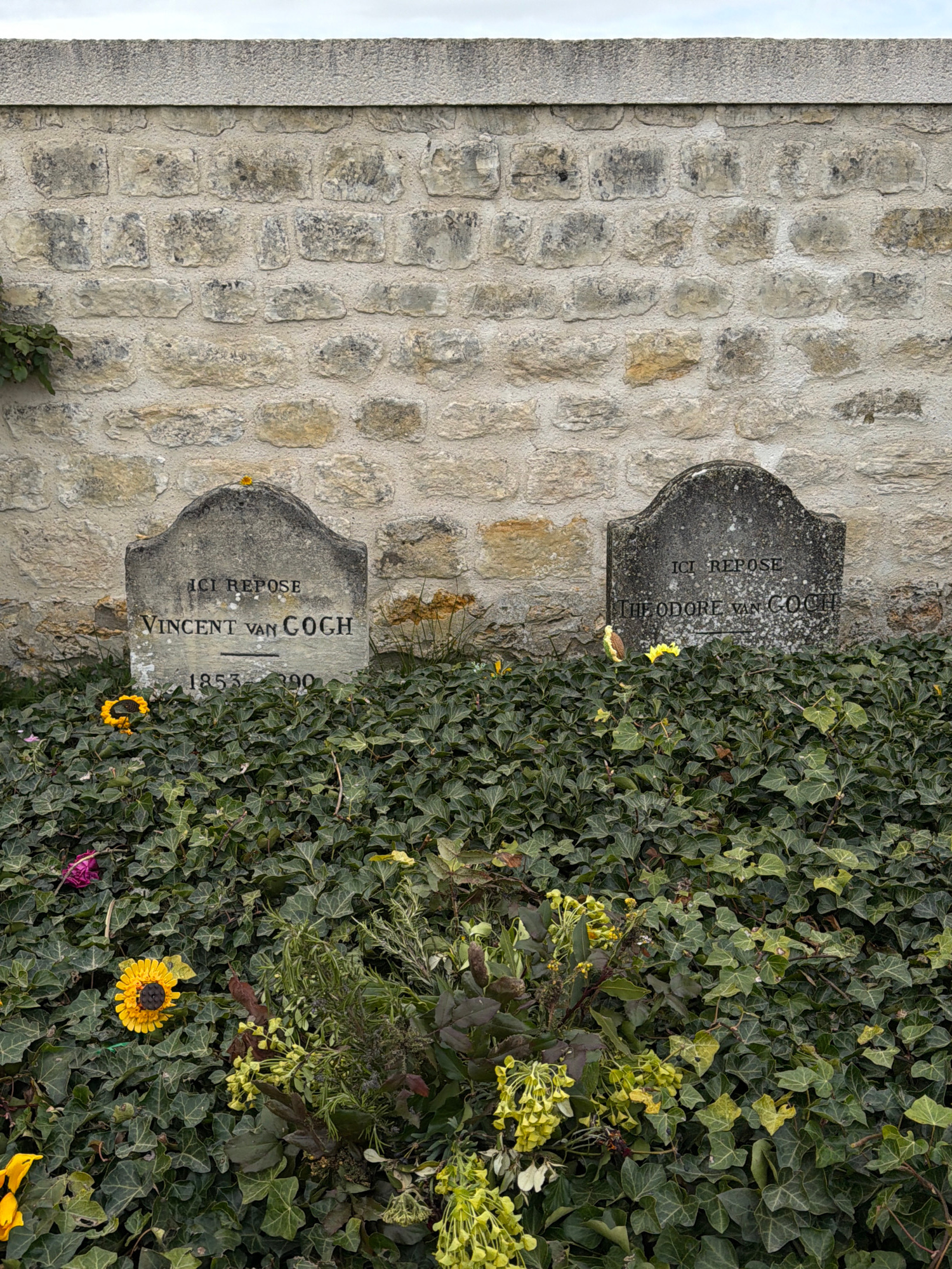 The image shows the graves of Vincent and Theo van Gogh at the Auvers-sur-Oise cemetery in France. The stone wall and ivy-covered ground are visible. Two stone grave markers are present. One is inscri…read more
