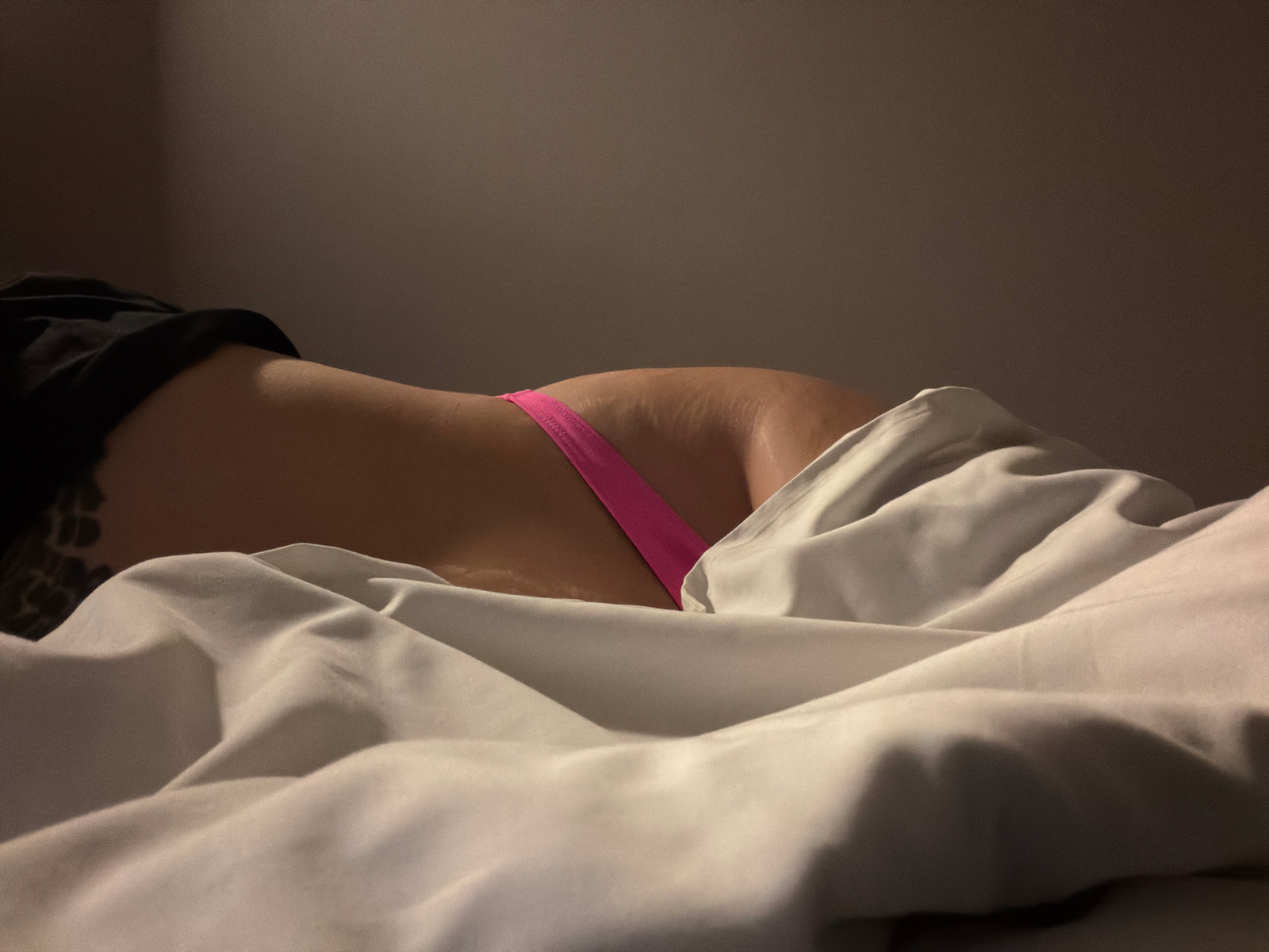 A close-up, low-angle shot shows a person lying in bed under a white sheet. A pink thong is visible, partially obscured by the sheet. The person is wearing a dark-colored shirt. The background is a pl…read more