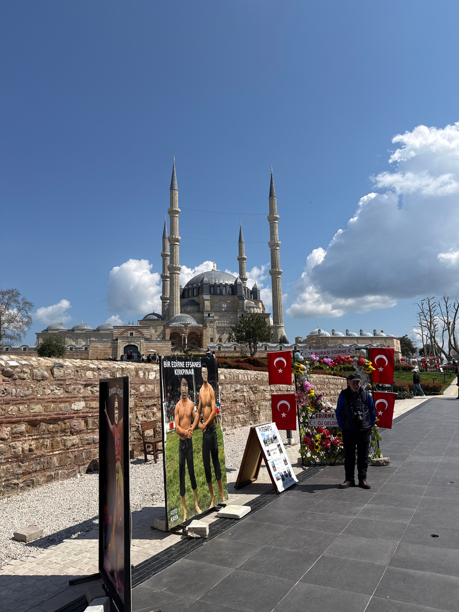 The image shows a view of the Selimiye Mosque in Edirne Merkez, Turkey, under a blue sky with white clouds. The mosque's minarets are visible. In the foreground, there are displays featuring photograp…read more
