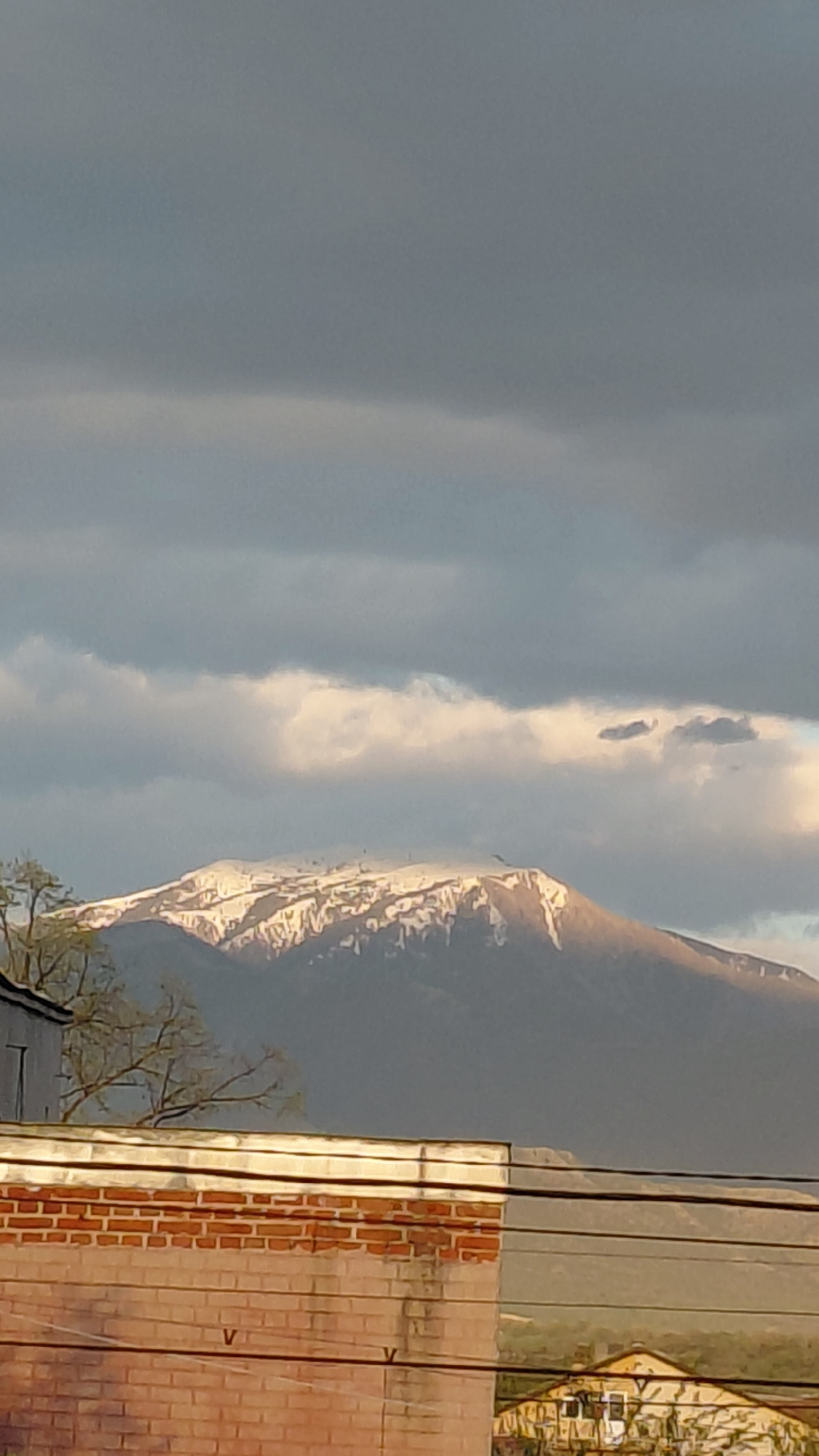 The image presents a view of a mountain range, partially covered with snow near the peaks, viewed from a vantage point in an urban environment. To the right of the mountain, there is a brick building…read more