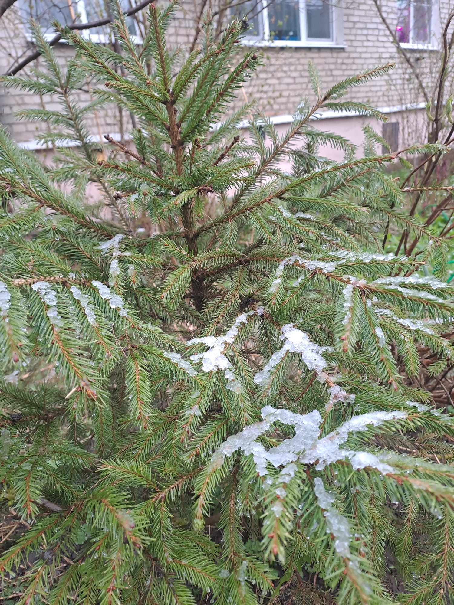 The image depicts a close-up view of a coniferous tree, likely a spruce, with needles covered in melting snow or ice. The tree is situated outdoors, as suggested by the presence of a brick building wi…read more
