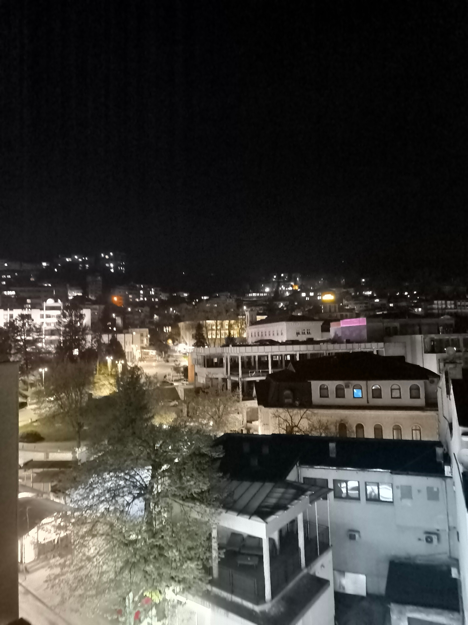 The image depicts a nighttime cityscape in Veliko Tarnovo, Bulgaria. The foreground features rooftops of buildings, some with visible windows and air conditioning units. A tree with illuminated branch…read more