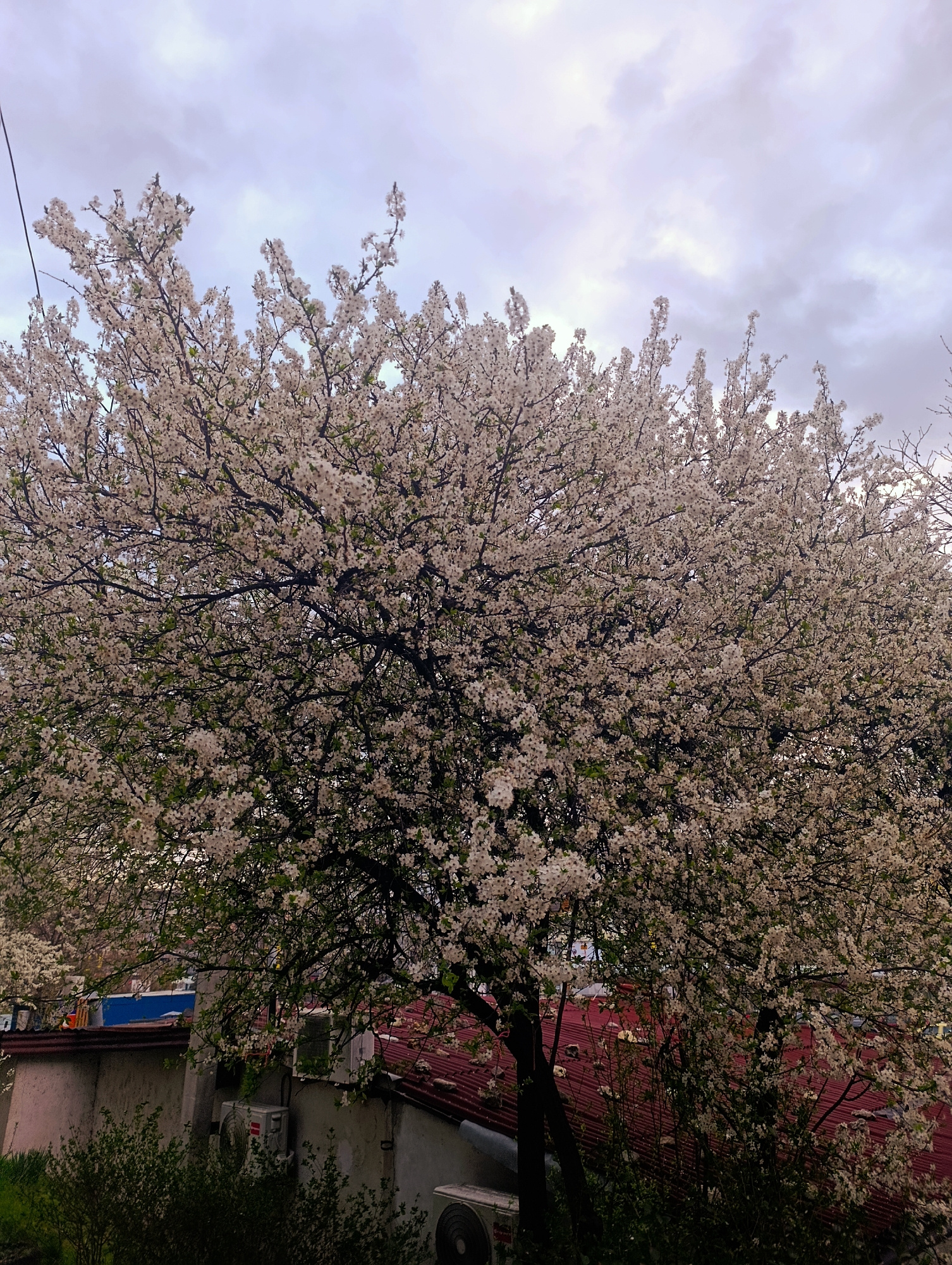 A full, blooming tree, possibly a cherry or plum, dominates the image. The tree is covered in white blossoms, and its branches extend across most of the frame. Behind the tree is a building with a red…read more
