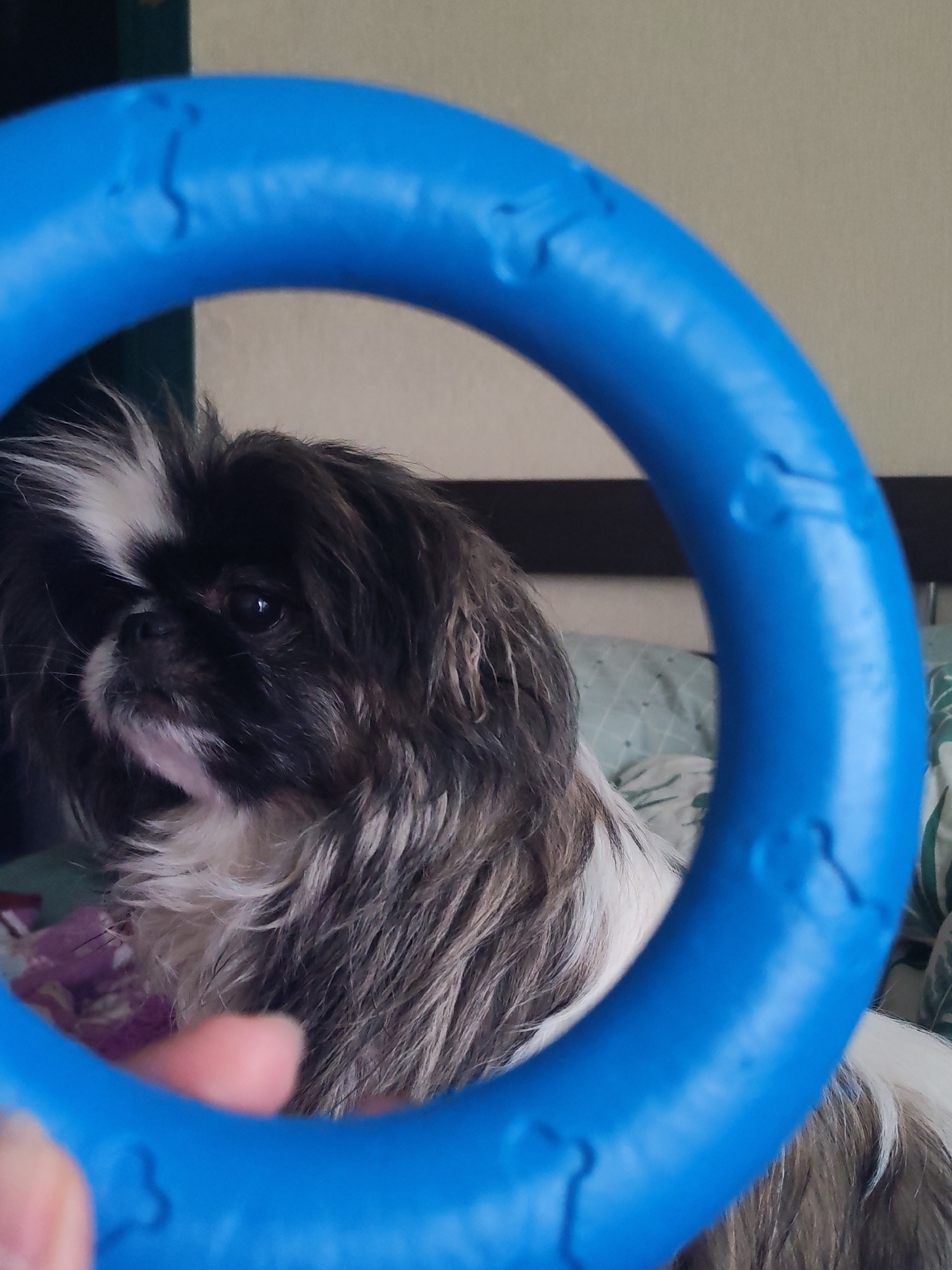 The image captures a close-up indoor scene featuring a black and white long-haired dog, likely a Pekingese, positioned centrally. The dog has dark fur with a prominent white stripe on its head and whi…read more