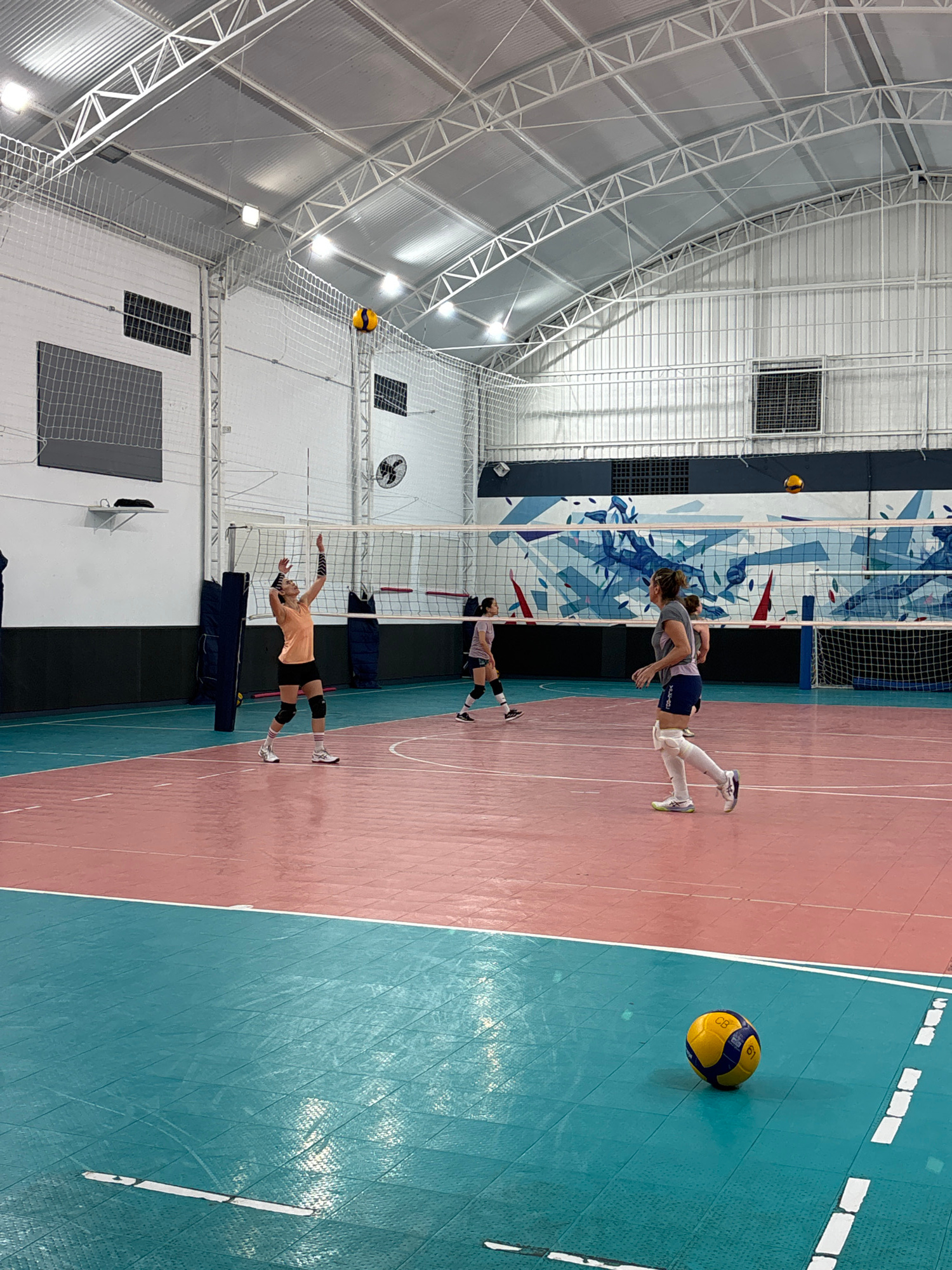 The image shows an indoor volleyball court, likely a training or practice space, with a volleyball in the foreground on the blue section of the court. The court is lined with red and blue sections, se…read more