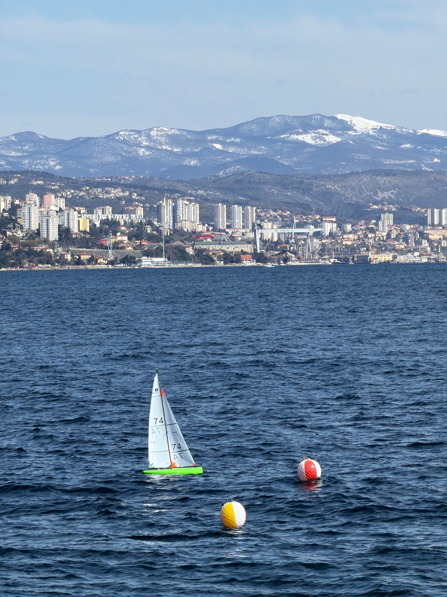 The image presents a maritime scene, observed from the coastal area of Grad Opatija, Croatia, looking across the Kvarner Bay towards the city of Rijeka. The foreground consists of deep blue water exhibiting moderate surface choppiness. A white-sailed remote-controlled sailboat with green trim on its hull and sail, marked with the numerals "74 AT," floats slightly left of center. To its right, two spherical buoys are present; one is yellow and white, and the other is red and white with a visible rope attachment point. The midground reveals the urban sprawl of Rijeka along the coastline, comprising numerous multi-story buildings, including modern high-rises. A prominent industrial port facility with multiple large cranes, one clearly labeled "ULJANIK," is visible on the right side of the cityscape. The far background features a range of mountains, partially covered in snow, under a clear, pale blue sky. No individuals are depicted in the scene. | Open Wire