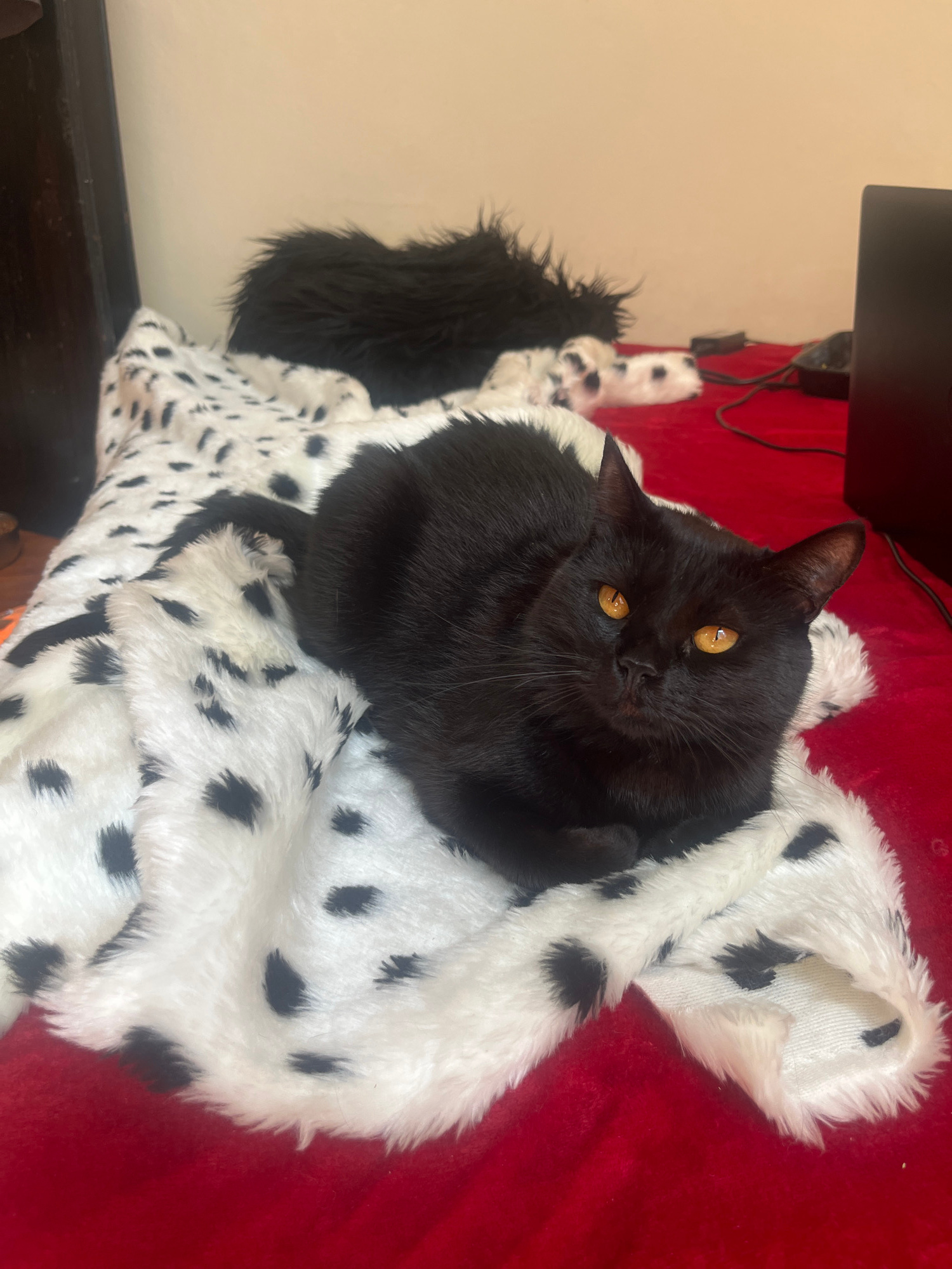 A black cat with amber eyes lies on a white faux fur blanket with black Dalmatian-like spots. The blanket is draped over a red surface. The scene is indoors, with a dark, indistinct object and a wall…read more
