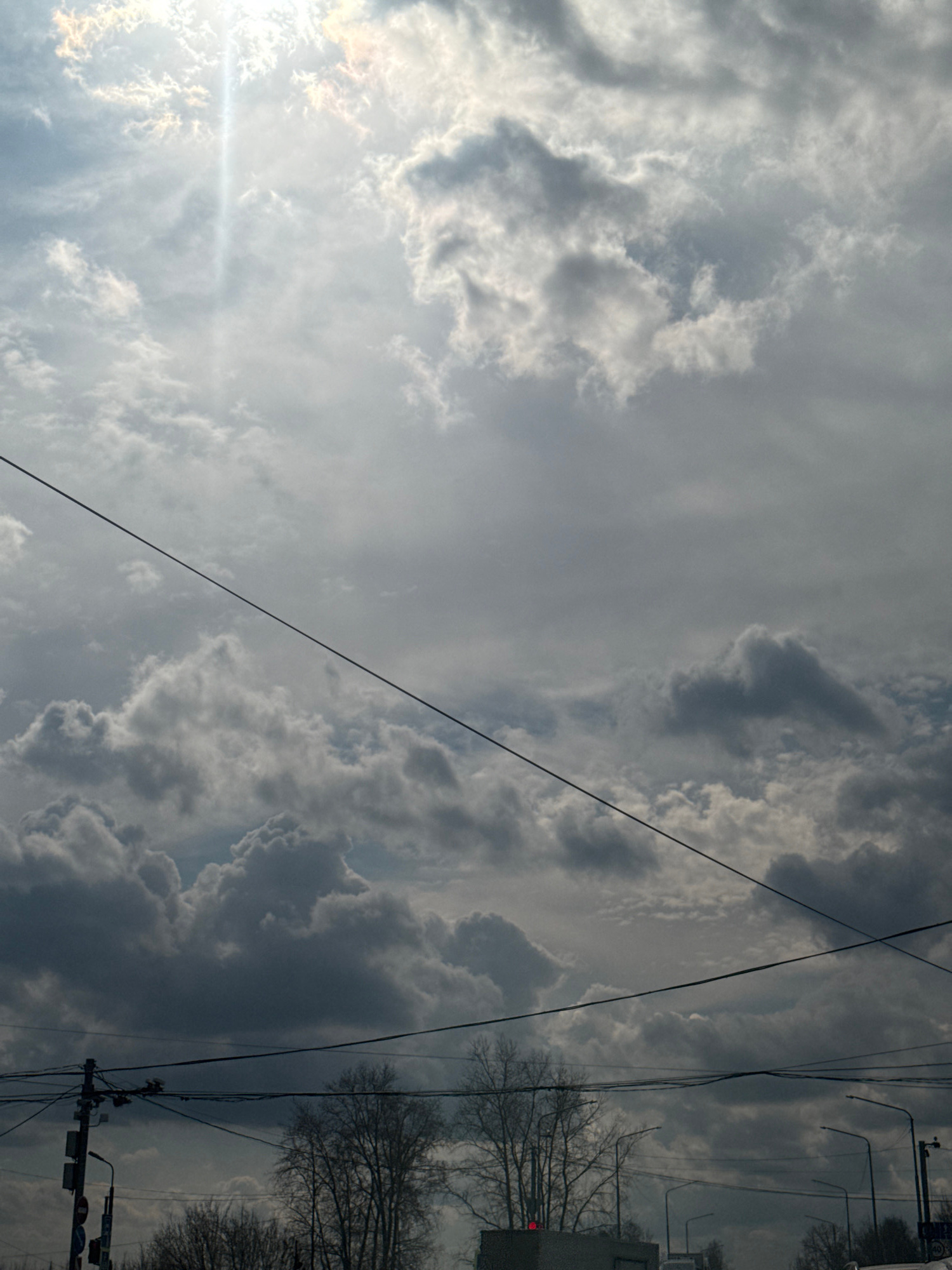 The image displays a sky filled with a diverse array of clouds, ranging from bright, sunlit white and light gray patches to darker, more ominous gray formations. On the upper left side, the sun is parβ¦read more