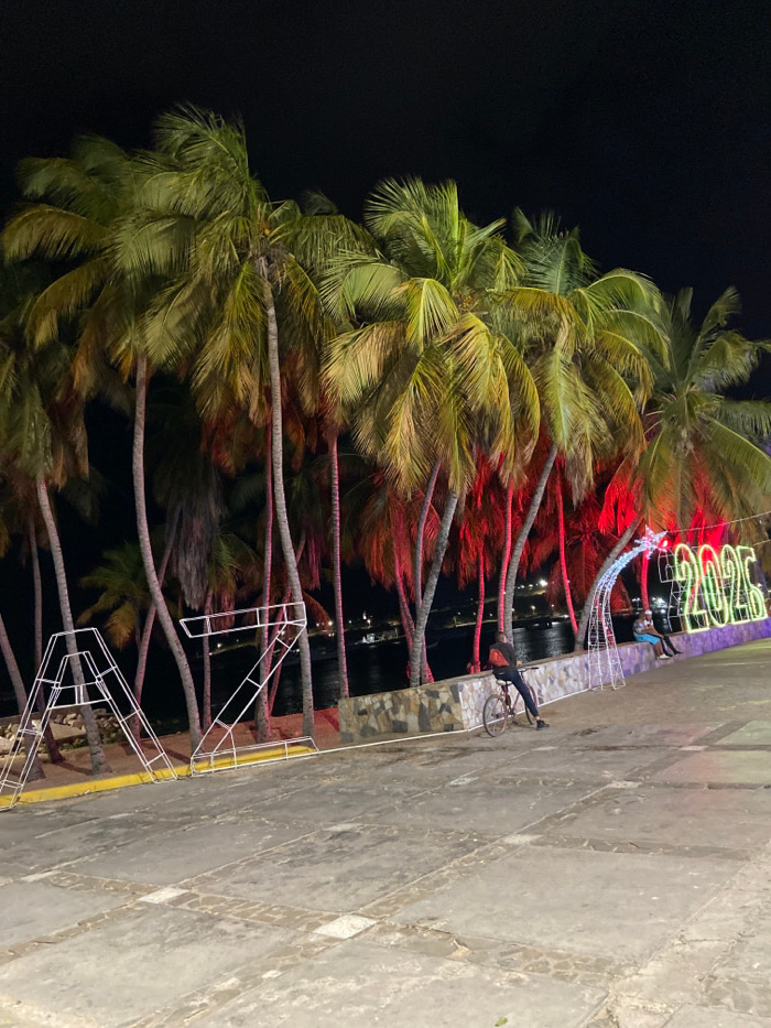 Tall palm trees line a dark waterfront at night, their trunks adorned with red lights. In the background, a bright "2021" display illuminates the scene. A figure on a bicycle is visible along the edge…read more