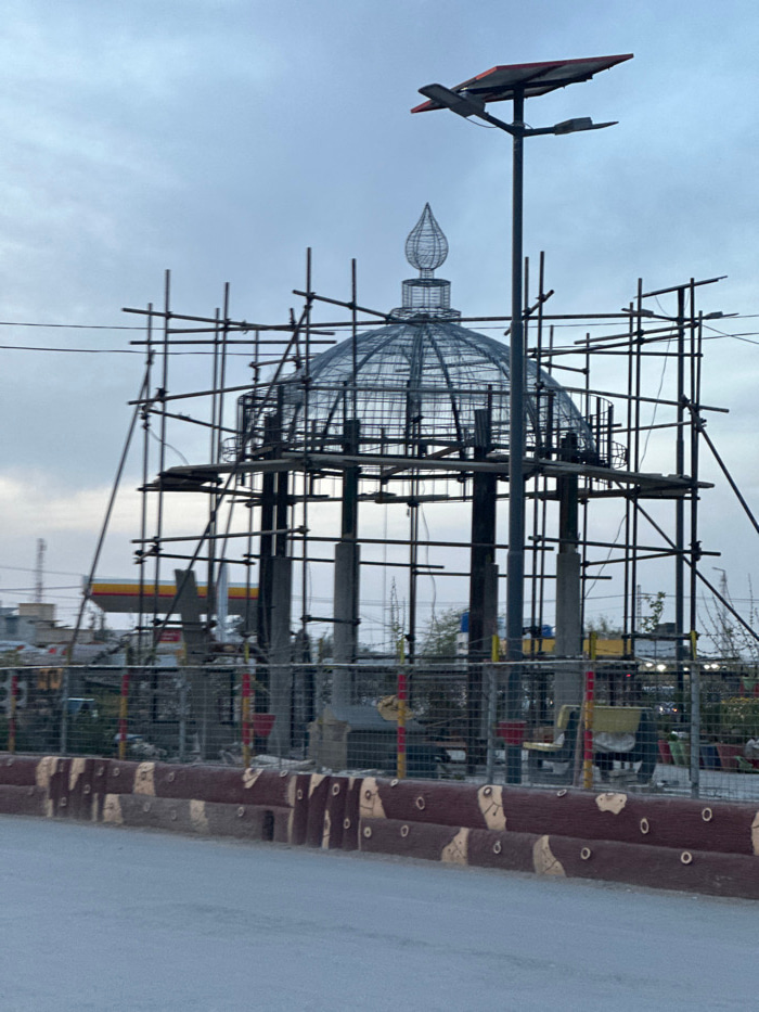 The image displays a construction site within Quetta City Tehsil, Pakistan, under an overcast sky. A partially constructed domed structure, made of a metallic or wire framework and topped with a promi…read more
