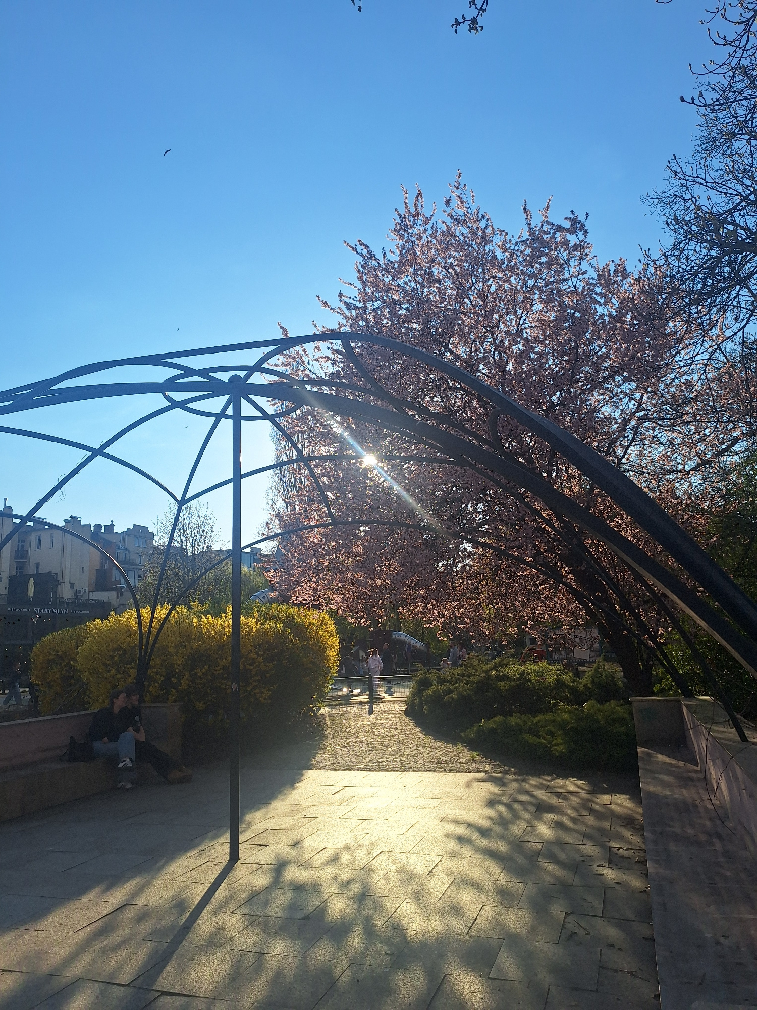 The image depicts a park scene, likely in Bydgoszcz, Poland. A metal archway structure dominates the foreground, with a blossoming tree visible through it. The sun shines through the tree, creating a…read more