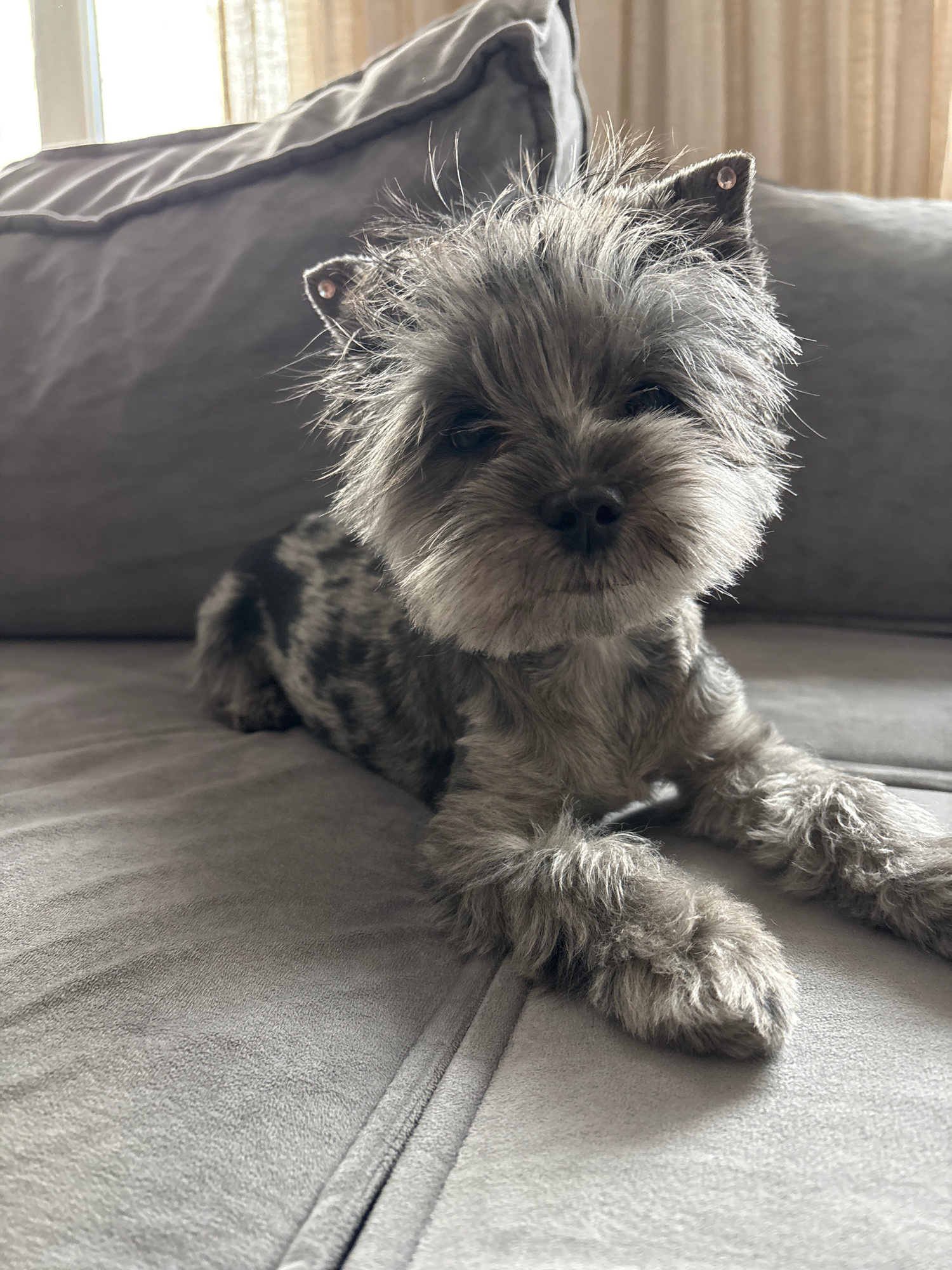 A gray, scruffy dog lies on a gray sofa. The dog is facing the camera and has beady eyes and a black nose. The dog's paws are resting on the sofa's armrest. The dog has two studs on their ears. The sc…read more