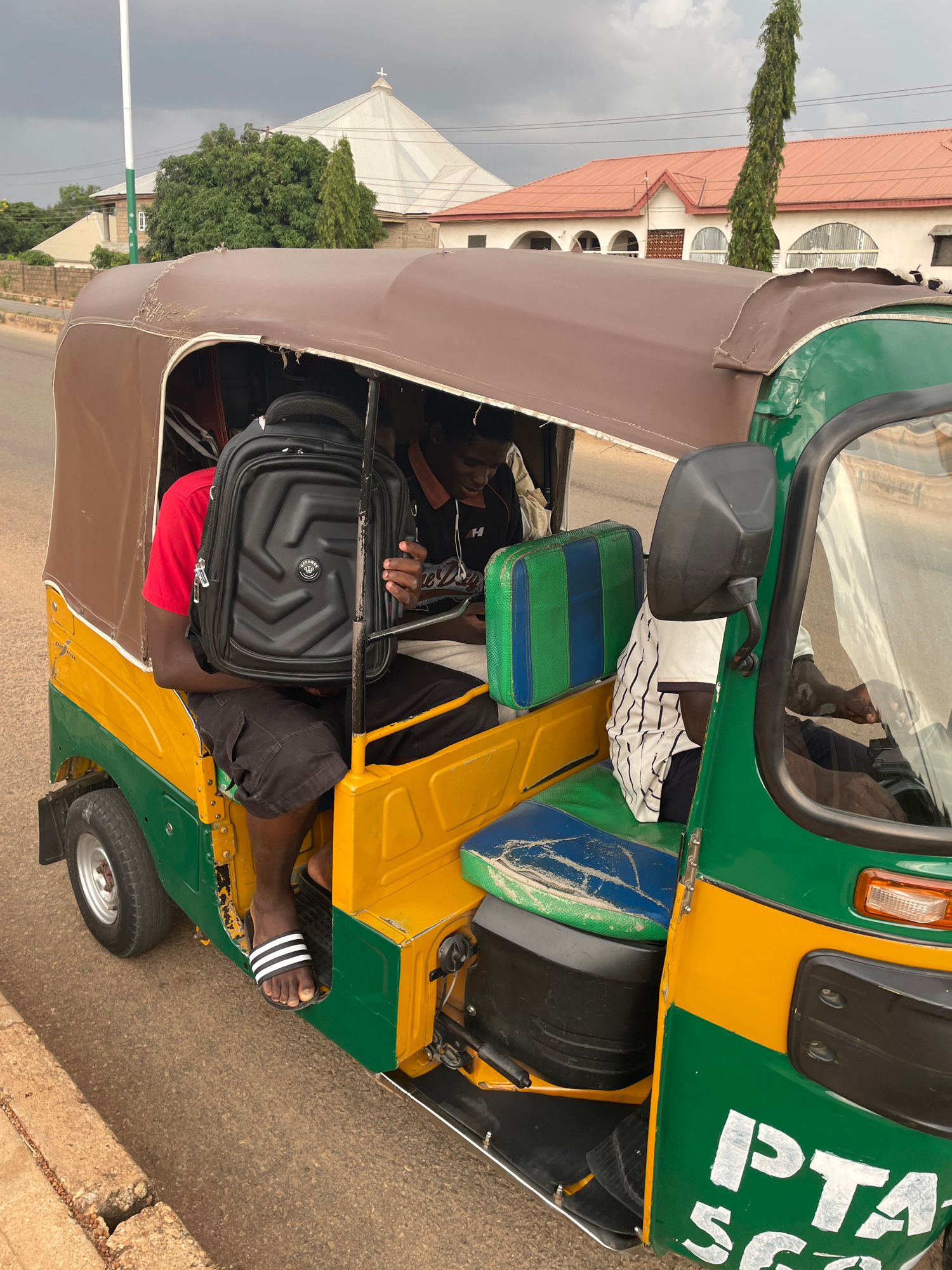 The image depicts the interior of a commercial tricycle in Jos, Nigeria, identifiable by the green and yellow paint scheme typical of "keke napep" transport vehicles. The tricycle is partially filled…read more