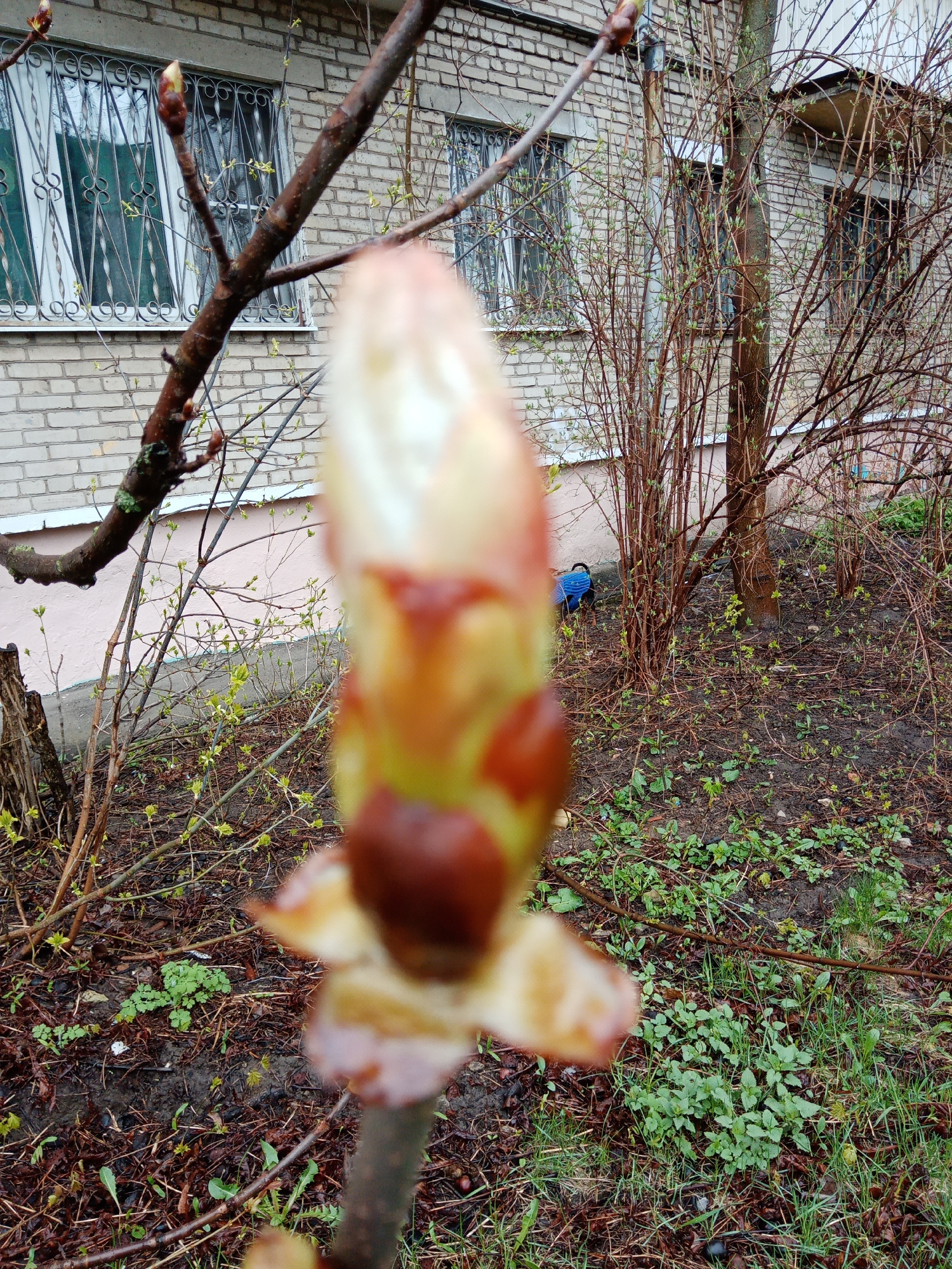 The image shows a close-up of a horse chestnut bud in spring. The bud is covered in sticky resin, with some scales already opening to reveal the emerging leaves. The background is blurry but shows a t…read more