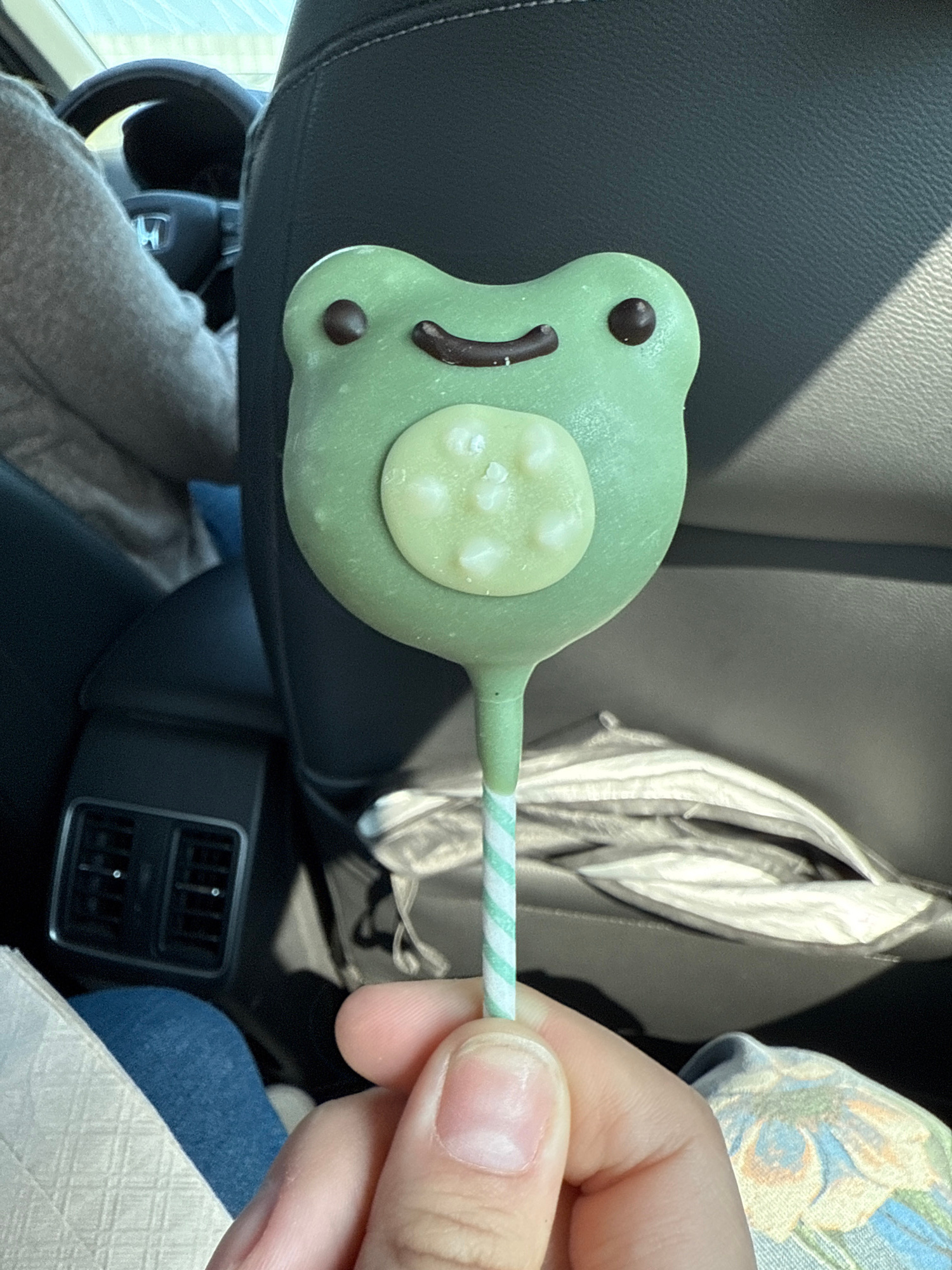A hand holds a green frog-shaped lollipop with a green-and-white striped stick. The lollipop has brown eyes and a brown mouth. A light-colored circle with white spots is on the frog's body. The backgr…read more