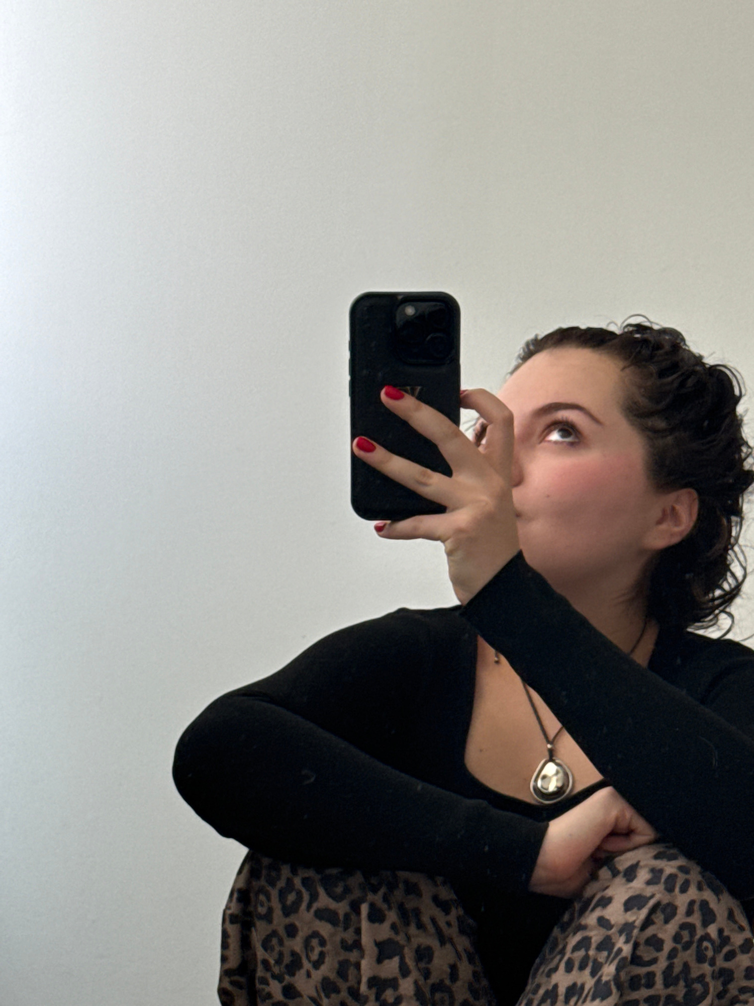 A woman with curly dark hair is holding a black smartphone in her left hand, taking a selfie. Her fingernails are painted red. She is wearing a black long-sleeved shirt and animal print pants or leggi…read more
