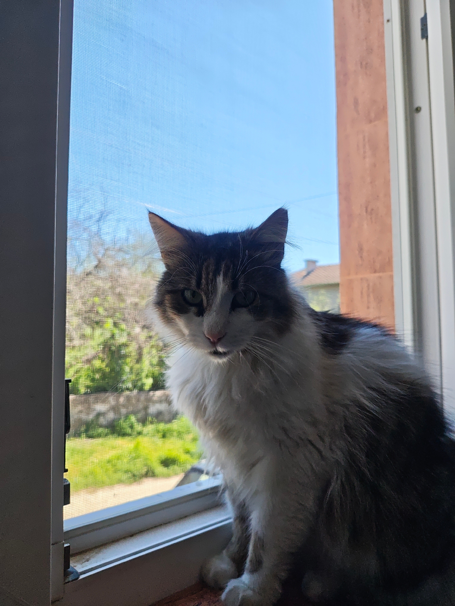 A fluffy, long-haired cat with white, black, and brown markings is sitting on a windowsill indoors. The cat is looking at the camera with green eyes. Outside the window, there is a blurred view of tre…read more